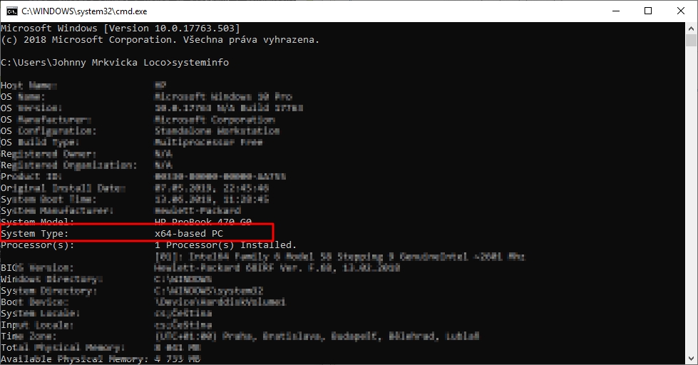 Přes příkazový řádekDalší možností je zjistit typ systému přes příkazový řádek: