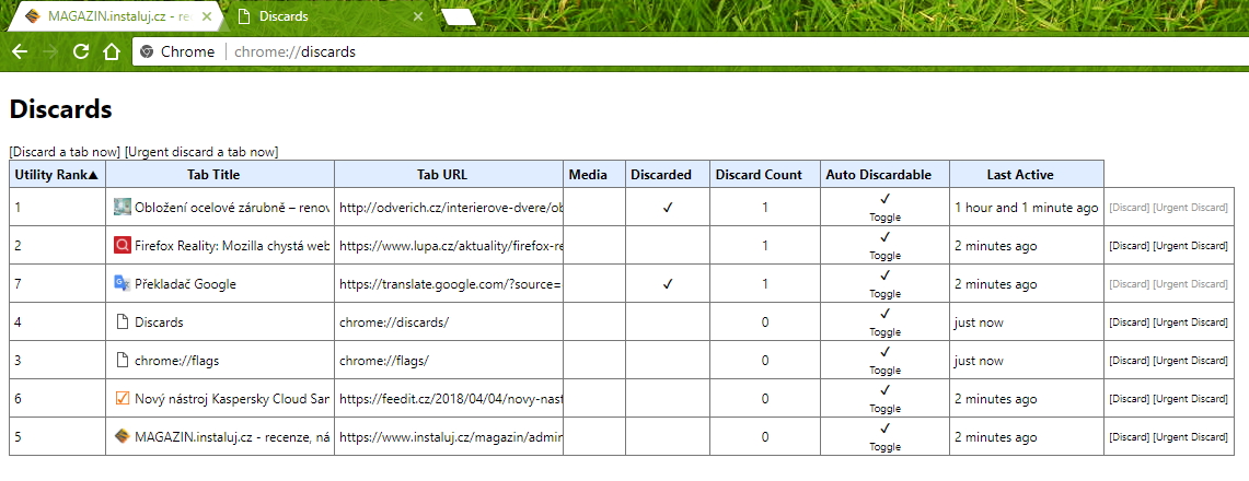 Našeptávání adres včetně meta titulků stránekChrome vám při vyhledávání přes adresní řádek našeptává již vyhledávané položky, navštívené weby a weby uložené v záložkách. U webových položek přitom může zobrazovat nejen URL adresu jednotlivých stránek, ale také jejich meta titulek, díky čemuž se v nich snadněji a rychleji zorientujete. Položku Omnibox UI Vertical Layout najdete coby #omnibox-ui-vertical-layout. Zvolte Enabled. Automatické uvolnění prostředků karet na pozadíChrome sice snižuje spotřebu neaktivních panelů, nicméně je neodřízne zcela. Toho můžete docílit až experimentálním nastavením Automatic tab discarding (#automatic-tab-discarding). Jeho povolením (Enabled) budou všechny neaktivní panely vyřazeny ze systémové paměti, a ta bude uvolněna pro jiné systémové operace. Ouško panelu se nadále zobrazuje. Po kliknutí na ouško se panel opět zcela znovu načte. Toto nastavení se může hodit především na slabších hardwarových sestavách. Přehled o vyřazování panelů ze systémové paměti najdete po zadání příkazu chrome://discards do systémového řádku. Vyřazení z paměti zde můžeme navíc urychlit odkliknutím položek Discard či Urgent discard ve výpisu panelů. Ikona pro rychlé utišení paneluRychlé utišení panelu je už celkem profláklý tip, který je ovšem natolik užitečný, že je téměř povinností po čisté instalaci Chrome rovnou zamířit do chrome://flags a tuto fičuru povolit. Ostatně těžko říct, proč si ještě nenašla cestu do výchozího nastavení prohlížeče. Funkce Tab audio muting UI control (#enable-tab-audio-muting) totiž ikonkou označí a umožní okamžitě kliknutím utišit panel, který přehrává zvuk. V záplavě karet, a zvláště v tichém prostředí, jde o funkci vskutku nepostradatelnou. Navíc tato funkce této ikonky nekoliduje s položkou Ztlumit web z kontextového menu ouška panelu. Je tedy možno mít ztlumený celý web a konkrétní straně povolit přehrávat zvuk, či naopak. Nabídka vygenerování hesla ChromemVyužíváte-li klíčenku (resp. automatické ukládání hesel) Chrome, pak je nasnadě použít i další jeho fičurku pracující s hesly - automatické generování hesel. Zvláště když dané heslo používáte jenom v daném prohlížeči, nepotřebujete si ho pamatovat či třeba má daná služba pro vás jen omezené využití. Po zapnutí funkce Password generation (#enable-password-generation) kdykoli Chrome detekuje vytváření nového účtu, nabídne při kliknutí na okénko nového hesla vytvoření hesla - dle principu dlouhé, malá a velká písmena, číslice, speciální znaky. Pokud by vám automatická nabídka generování hesla přišla otravná, můžete ji alternovat funkcí Manual password generation (#enable-manual-password-generation), která nabídku přesune do kontextového menu vyvolaného po kliknutí pravým myšítkem do okna nově vytvářeného hesla. Nenechte weby bránit vám v požadované navigaciNa některých webech si nachází míso nekalá praktika snažící se docílit setrvání uživatele na daném webu, a to tím, že web generuje falešné záznamy v historii prohlížení. Aniž byste na daném webu cokoliv udělali: přesouvali se mezi jeho podstránkami či jej třeba opětovně načítali, v historii prohlížení generuje nové a nové záznamy se stále toutéž URL. Při pokusu odejít z tohoto webu přes tlačítko zpět, pak stále zůstáváte na tomtéž webu, neboť Chrome v rámci navigace načte jen starší záznam v historii prohlížení - tedy tentýž web. Abyste zabránili takovémuto chování, povolte funkci New history entries require a user gesture (#enable-history-entry-requires-user-gesture). Ukotvení obsahuObsah webů se nenačítá najednou, ale různé prvky se načítají v pořadí, v jakém je jim určena priorita. V důsledku toho pak může strana v průběhu scrollování různě poskakovat. Znatelné je to především na pomalejších připojením a méně výkonných sestavách. Povolením funkce Scroll Anchoring (#enable-scroll-anchoring) zabráníte tomu, aby vám uskočila pozice scrollování webu, ke které jste dospěli. Zvláště vhodné je fičurku Scroll Anchoring povolit na smartphonech. Podpora HDR v ChromeMáte-li monitor podporující technologii vysokého dynamického rozsahu (alias HDR - High Dynamic Range), pak k přehrávání odpovídajícího obsahu nemusíte používat pouze Microsoft Edge, jenž s podporou HDR přišel jako první. Chrome Vám umožní totéž, stačí si jen v experimentálních nastaveních povolit HDR mode (#enable-hdr). Zobrazte si uloženou kopii webuNedaří-li se vám připojit k webu (třebaže nejste připojeni k internetu), nemusíte čekat na opětovné připojení. Je-li v mezipaměti uložená kopie webu, můžete si zobrazit tuto. Stačí u funkce Show Saved Copy Button nastavit Enable:Primary, což na straně s chybovou hláškou o nepřipojení k webu zobrazí tlačítko Zobrazit uloženou kopii a po odkliknutí ji skutečně zobrazí. Funkce ještě disponuje možností Enable:Secondary, což by tlačítko k zobrazení uložené kopie webu mělo zobrazovat u/na ikonky znovunačtení webu, ovšem v testovém případě tak nečinilo. Daná funkce je opět jako stvořená pro mobilní zařízení, která se přeci jen častěji ocitají bez připojení k internetu.