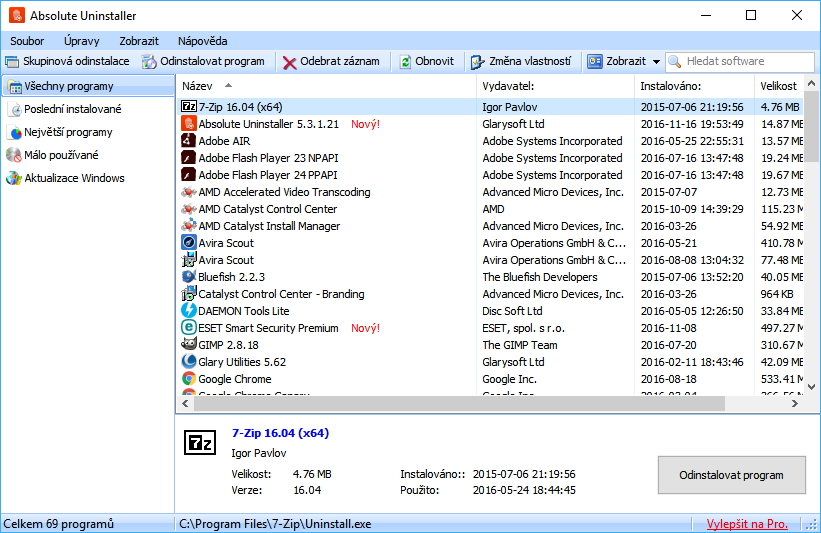 Coby podfiltry se dají k seřazení seznamu využít i jejich parametry Název, Vydavatel, Instalováno (datum) a Velikost. Díky filtrům a podfiltrům snadno najdeme aplikaci, již chceme odinstalovat. Orientace a ovládání je tedy velmi snadné - horší je to s funkčností... Možné problémy se dají odhadnout už z toho, že Absolute Uninstaller špatně identifikuje verze nainstalovaných programů. Nezobrazuje seznam Aktualizace Windows. Do seznamu Málo používané zahrnuje i aplikace, které jsou používány každodenně. Stejně tak seznam Největší programy obsahuje i aplikace o velikosti 50 MB. Jediným funkčním seznamem tak patrně je Poslední instalované. Neodinstaluje soubory, které mají poškozené instalační záznamy a není je schopna odinstalovat ani systémová aplikace. Proto ztrácí opodstatnění coby separátní aplikace určená pouze k odinstalaci programů - ostatně ve free verzi ani neobsahuje rezidentní modul odinstalátoru, který by monitoroval nově přibývající instalace a umožňoval jejich úplné odstranění ze systému. Absolute Uninstaller shrnutíAbsolute Uninstaller v bezplatné verzi své současné podoby je jen dalším rozhraním nad systémovou aplikací pro odinstalaci souboru. Nedokáže provést operace odinstalace natvrdo - tedy odinstalace, kterou není schopen provést sám systém, protože jsou poškozeny instalační soubory. Ani monitoruje a nezaznamenává údaje o nově instalovaných programech takovým způsobem, aby mohl následně zlikvidovat veškerý zbytkových odpad (typu různých zápisů ve složkách ProgramData, User, TEMP aj.) a zbytečné zápisy v systémovém registru. Navíc není kompatibilní s nejnovějšími Windows 10 - nezobrazuje instalované aktualizace, které by stejně nemohl sám odebrat. Vzhledem k těmto skutečnostem nemá coby separátní aplikace v systému žádné opodstatnění. Po separátním odinstalátoru s pokročilými funkcemi je třeba poohlédnout se jinde.