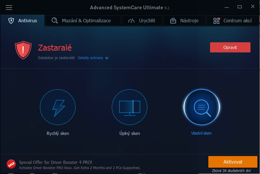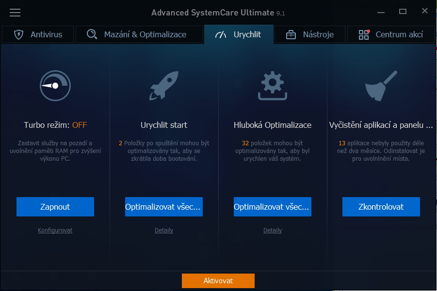 Instalace Advanced SystemCare Ultimate je prostá - instalátor identifikuje i systémový jazyk, pokud byste chtěli změnit, volba se skrývá vpravo nahoře. Pod možnostmi instalace se (u IObit) kupodivu neskrývá žádný adware, pouze umístění programu a vytvoření zástupce na ploše. Proto můžete s klidem v duši Přijmout a instalovat. Po instalaci se Advanced SystemCare Ultimate rovnou spouští a hlásí zastaralé komponenty vlastních databází, programu samého i všeho ostatního v systému, co spadá pod jeho pravomoc. Rovnou vidíme, že verze ASC Ultimate obsahuje i antivir. Dle všeho jde o antivir alternativního názoru (second opinion), jak je zvykem označovat v anglofonním prostředí. Z toho plyne, že se tento antivir nedostává do konfliktu s primárním antivirem (ostatně i v nastavení Ochrany v reálném čase se objevuje hláška Používáte kompatibilní režim). Ovšem těžko říct, jak by primární antivir reagoval na systémové změny, které by chtěl provést sekundární antivir - nejspíš by je všechny zablokoval a bylo by je třeba provést se souhlasem antiviru primárního. Což zcela odpovídá konceptu antivir druhého názoru. Jinak nastavení antiviru je typické, možná lehce substandardní - neobsahuje běžná množství předvoleb. Antivir ASC je schopen běžet v režimu rezidentního štítu za různých úrovní ochrany, provádět vyžádané skeny systému s určenou hloubkou opakování a danými výjimkami, vést záznamy akcí, udržovat karanténu - a spouštět určité programu v režimu Auto-tichý Mód. Tento nebývá zcela běžný - jde o režim, v němž ASC při běhu určených programů sníží úroveň ochrany na nízkou, vypne vlastní aktualizace a skeny (a v důsledku toho tedy i sníží vlastní spotřebu systémových prostředků). Těžko říct, zda je tento režim snížení bdělosti ku prospěchu, zvláště v době, kdy už se nevyplácí udělovat výjimky z bezpečnostní prověrky čemukoliv - možná jen na nevýkonných starých strojích. Mazání a OptimalizaceDalší položkou je samotný základ produktu ASC - tedy optimalizace napříč systémem. Jde o klasickou optimalizaci jedním kliknutím (i když tak v překladu není označena). Vybereme jednotlivé položky této jednorázové optimalizace a necháme ASC odvést svou práci. ASC vyhodí seznam optimalizovatelných položek. Některé jsou nejspíš méně problémové (typu Stopy soukromí - vyčištění cache prohlížečů a historií otevíraných souborů), některé je lépe zkontrolovat a přehodnotit (např. vynucování Turbo režimu Opery na výkonných strojích a rychlých sítích - a vícero voleb u optimalizace prohlížečů). Optimálně tedy poupravíme volby optimalizace a dáme opravit - ASC naštěstí vytváří bod obnovení systému, což by nám mělo pomoci nechtěné změny zvrátit. Urychlit aka další optimalizacePokud karta Mazání a Optimalizace představují běžné optimalizace systému, na kartě Urychlit najdeme optimalizace, které mají ještě více přizpůsobit systém a jeho využívání konkrétnímu uživateli a tak dosáhnout ještě hladší kooperace. Turbo režim je mód, jemuž se v minulosti dařilo vyvolávat kontroverze. Nabízí totiž vypnutí nepotřebných komponent a služeb Windows, ovšem k bezchybné práci potřebuje v problematice orientovaného uživatele. Je totiž třeba vědět, co člověk vlastně ze systému používá - a co ne. V nastavení funkce se ASC samozřejmě snaží vyjít uživateli vstříc a poskytuje mu i obecné šablony (pracovní, herní a ekonomický [na výdrž baterie orientovaný] režim). Navíc uživatel i vidí i změny v nastaven systémových služeb při volbě konkrétního režimu. Nicméně je třeba stále vědět, co vlastně člověk používá a zda si může dovolit vypnout např. vyhledávání Bluetooth zařízení či podporu skeneru. Název položky Urychlit start je samovysvětlující. Krom aplikací spouštěných po startu systému, zpřístupňuje i služby v ten moment spouštěné, nastavení plánovaných úloh a položky spouštěné se startem prohlížečů. Hlubová optimalizace směřuje do nitra systému, nastavení disku a síťových přenosů. Systémové optimalizace zahrnují například chování procesoru při sledování filmů, zvýšení vyrovnávací paměti při bootování, optimalizaci výkonu hard disku při čtení atd. Vyčištění aplikací a panelu nástrojů má za úkol nás upozorní: