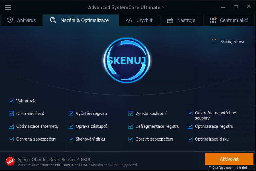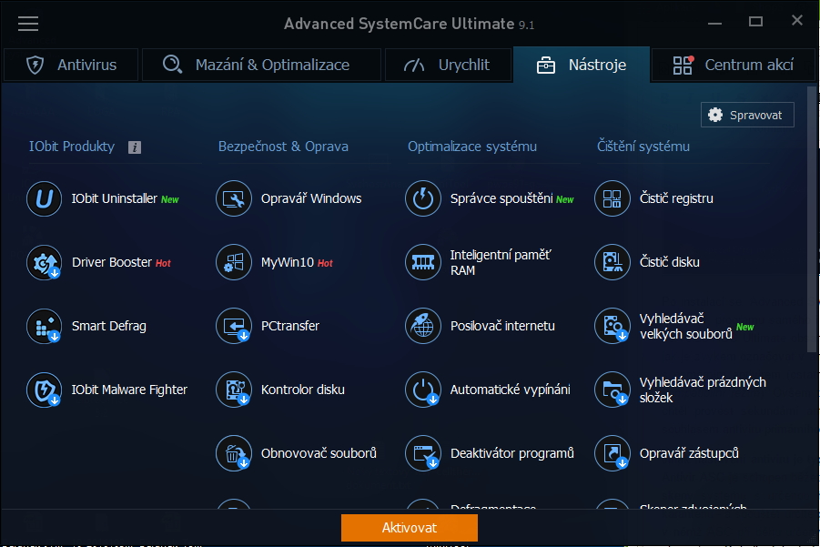 Advanced SystemCare Ultimate: ultimátní balík pomocníků KE STAŽENÍAdvanced SystemCare ve verzi Ultimate přináší neuvěřitelnou škálu nástrojů a utilit nejen pro vyčištění a optimální úpravu nastavení systému Windows, ale také pro správu nejrůznějších parciálních funkcí, aktualizaci aplikací a ovládačů, údržbu stavu hard disku, správného nastavení síťového provozu a mnoho další. Verze Ultimate také zahrnuje vlastní antivirus, fungující i ve verzi rezidentního štítu, a antimalware.