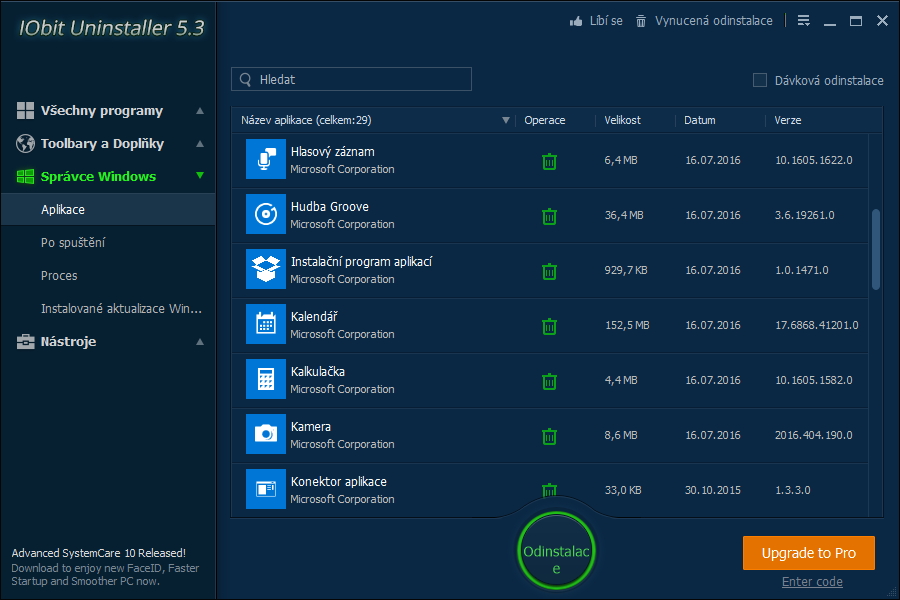 NástrojeKarta Nástroje skýtá náhled na jednotlivé funkce ASC, které se jednak skrývají v shlucích obecných nástrojů představených dříve, jednak v produktu přítomny nejsou a je je třeba teprve stáhnout (např. Driver Booster, Smart Defrag). Obojí pak doplňují partikulární utility (např. Inteligentní paměť RAM), kterými můžeme provést jednorázová čištění/optimalizace určitých komponent systému. Díky těmto nástrojům lze tedy provádět partikulární operace, zkontrolovat aktuálnost ovládačů (Driver Booster), provést důkladnou defragmentaci disků (Smart Defrag), provést malwarovou analýzu (Malware Fighter), rychlou zálohu dat (PCtransfer), vyhledat duplicity, neobnovitelně smazat soubory, přizpůsobit vzhled Windows a mnoho jiného. Centrum akcí už jen zprostředkovává přístup k nejdůležitějším funkcím (dle ASC aktualizace programů, ovládačů, defragmentace). Nastavení ASC obsahují už jen plošná nastavení jednotlivých funkcí, přičemž nejčastěji se jedná o jejich nepřetržité spuštění a analýzu systému. Advanced SystemCare UltimateAdvanced SystemCare Ultimate přináší ultimátní balík všemožných úprav, oprav, poupravení nastavení a optimalizací systému, procesoru, RAM, hard disku, síťového provozu a mnoha těžko vyjmenovatelných maličkostí. Gró jeho funkce spočívá v čištění a optimalizacích, která v podstatě rozděluje na běžné a méně běžné - více zasahující do systému. Změny sebou prováděné zabezpečuje vytváření bodů obnovení. To doplňuje celou škálou pomocných programů, které pomáhají zabezpečit aktuálnost aplikací a ovládačů, udržovat hard disky defragmentované, pomoci uživateli s přizpůsobením vzhledu systému - ale i s odstraněním systémových aplikací Windows 10. Nevýhody Advanced SystemCare Ultimate