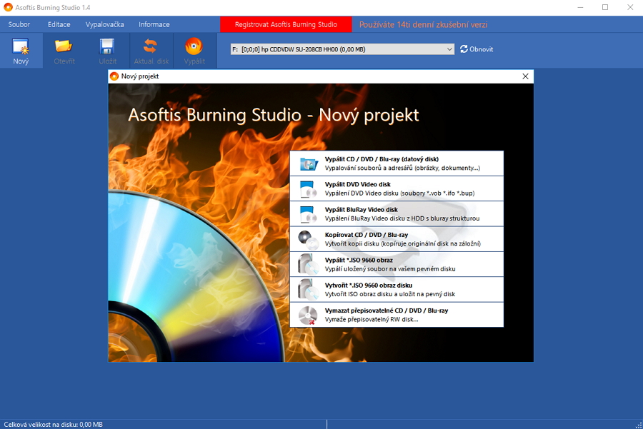 Instalace je stejně jako celý program v češtině - ostatně jako všechny aplikace z dílny vývojářského studia PS Media. Upřesníme pouze umístění a pár triviálních voleb (ikonka na ploše a umístění v seznamu aplikací), nic překvapivého nás nečeká. Po startu jsme vybídnuti k volbě vypalovacího projektu (netřeba volit hned - tutéž nabídku pak najdeme pod Soubor - Nový). A dle typu zvoleného projektu jsme vedeni k úspěšné realizaci: