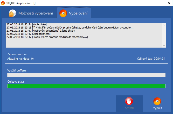Asoftis Burning Studio umožňuje použít nejen systémový ovladač Windows WinASPI, ale i svůj vlastní interní ovladač. Díky tomu, že program není závislý na systémovém ovladači, ani žádných externích DLL knihovnách, je vysoce stabilní a s jeho pomocí je možno vypalovat i poškozeném systému trpícím rozličnými konflikty kompatibility. Asoftis Burning Studio pracuje velmi svižně - jedinou brzdou procesu může být nedostatečně výkonný hardware systému či nedostatečně výkonná vypalovačka. Kopie zdrojových disků vytvářel rychlostí přes 100 MB/m (680MB ISO Ubuntu bylo hotové za 5 a kousek minuty, podpoloviční instalačka nLitetnutých Windows XP za dvě a kousek minuty). Vypalování proběhlo bez jakýchkoliv problémů a podtečení dat na plnou rychlost v lehce zatíženém systému (Chrome - 10 -15 panelů, VLC, antivir a služby na pozadí) vždy na maximální rychlost (24x). Podpora médií a formátůProgram vypaluje patrně na všechna média, ať už CD (CD-R, CD-RW), DVD ((DVD-R, DVD + R, DVD-RW, DVD + R, DVD-RAM a dvouvrstvá DVD + R DL a DVD-R DL), Blu-ray (BD-R, BD-RE, BD-R DL, BD-RE DL i velkokapacitní BD-XL) i vysoce odolné M-disky. Podporuje všechny počítačové formáty - u formátu VOB, IFO, BUP pro video DVD rovnou připraví i odpovídající adresářovou strukturu. Coby zdroj dat pro něj není problém žádné rozhraní (namátkou EIDE, USB, FireWire [IEEE-1394], Thunderbolt, SATA, e-SATA]. Poslední maličkost, kterou by bylo škoda opomenout, je možnost pracovat s více vypalovačkami najednou v případě, že je tak naškálován systém. Asoftis Burning Studio zleva zpravaAsoftis Burning Studio je všestranný program pro vypalování, okamžité 1:1 kopírování disků a zálohování i archivaci dat. Veškeré dostupné zdroje je schopen převést do podoby audio, video či datových CD, DVD a Blu-ray disků. Podporuje i vysoce odolné M-disky, díky čemuž je ho možno využít i pro dlouhodobou archivaci důležitých dat (typu účetních a mzdových). Je sice oproštěn o funkce typu konverze datových formátů či třeba vytváření obalů, nicméně ty jen zbytečně rušily základní filozofii programu snadno a rychle vypálit data. Té odpovídá i naložení s nastavením programu: ve výchozí podobě je nastavení voleno tak, aby bylo optimální pro 95 % případů vypalování, a zbytečně nerušilo práci s programem. Přesto jsou dostupná i velmi podrobná nastavení pro pokročilé uživatele. Výhody Asoftis Burning Studio