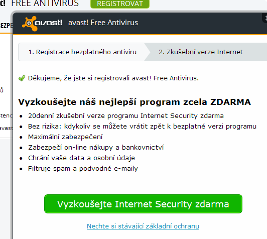 Po registraci vám bude nabídnuta ještě 20 denní zkušební verze Internet Security - je na vás jestli program nainstalujete.
