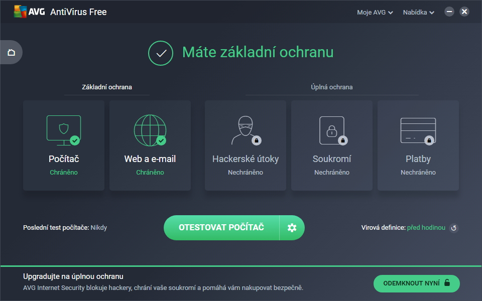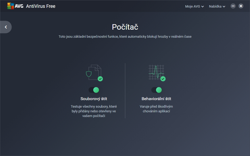 AVG sází na rozfázovanou instalaci. Samotný instalátor má jen 3,28 MB, veškerá potřebná data si dotahá sám až po spuštění instalace. Hned ze startu se ujistí, že opravdu chcete nainstalovat základní ochranu (tedy AVG AntiVirus Free), a nikoliv třeba vyzkoušet Internet Security, který je po 30 dnech nutno zakoupit. Po zahájení se již instalace na nic neptá. Rovnou instaluje všechny komponenty odpovídající Free produktu, a to bez výběru do složky systémového disku (typicky C:\Program Files [x86]). AVG nevyžaduje okamžitý restart. Vzhledem k systému a produktu je ho lepší stejně provést. AVG sází na jednoduché rozhraní. Free verze motivačně zobrazuje všechny moduly, o které uživatel přichází nepoužíváním Internet Security. Krom toho vidíme čas uplynulý od poslední aktualizace virových definic a od posledního testu na požadavek. Moduly dostupné bezplatnému užívání jsou rezidentní štíty on-demand testy. PočítačV kategorii Počítač najdeme rezidentní moduly: