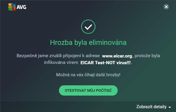 V základní nabídce je štíty možno pouze zapnout či vypnout. Veškerá jejich nastavení se skrývají v odpovídající sekci aplikace. Web a e-mailZcela stejně jednoduše je provedena sekce Web a e-mail, zahrnující štíty, které operují na rozhraní internetové komunikace. Emailový štít je při nepoužívání desktopového klienta možno rovnou vypnout. Jeho funkce jednak přebírají používané online mailery, jednak webový štít (při stahování příloh mailů do počítače). Webový štít funguje bezproblémově a blokuje veškeré přicházející útoky a pokusy o stažení škodlivého kódu. Při hrozbě AVG vyhodí odpovídající hlášku s detaily v podobě: