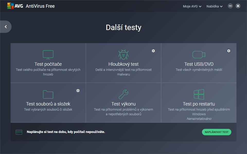 Ozubená kolečka u jednotlivých testů umožňují přímý proklik k jejich konfiguraci v části Nastavení. A také je zde plánovač spuštění, který nabízí nejen konfiguraci času testů, ale rovnou vytvoření vlastního testu na míru včetně citlivosti, testování celých souborů, archivů, potenciálně podezřelých souborů, následování odkazů, emulace kódu, priority procesu atd. Nastavení AVG AntiVirusNastavení najdeme pod položkou Nabídka hlavní obrazovky, kde se ještě skrývá nástroj na skartaci dat File Shredder, Karanténa, odkazy na nápovědu a podporu a informace o programu AVG AntiVirus Free. Nastavení nabízí úpravu celé řady položek: