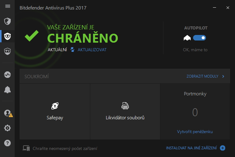 Instalátor si nejprve natahá nějakých 369 MB instalačních dat a je připraven k instalaci. Neangličtináři i všichni ostatní, kteří rádi češtinu, ji rovnou můžou nastavit v kolonce vpravo. V přizpůsobení instalace (tlačítko Custom Install/Vlastní instalace) můžete upravit systémové umístění programu, nastavení proxy serverů a skenování počítače již při instalaci (defaultně zapnuto). Instalaci následuje vytvoření či přihlášení se k cloudovému účtu Bitdefenderu. Prostředí aplikace je zase o něco přehlednější a učesanější. Minimalistický koncept grafiky narušuje pouze decentní ilustrace fajfky stavu Vaše zařízení je chráněno, případně ilustrace aktualizace. Všechny základní funkce jsou okamžitě přístupné., Záznamy o všech proběhlých aktivitách se zobrazují pod ikonkou zvonečku (Upozornění) - a jsou oznamovány notifikací číslovky odpovídající počtu nových zpráv. Pro minimalizaci interakce uživatele s aplikací je defaultně zapnut režim Autopilot, který odbavuje veškerá rozhodnutí, která může jinak činit uživatel sám - stačí autopilota vypnout. Rychlý antivirový sken na hlavní obrazovce doplňuje užitečně pojatý Sken zranitelností, který vyhodnocuje možné bezpečnostní díry z hlediska aktuality programů, systémových aktualizací, síly hesel a nastavení připojení k Wi-Fi síti. V testu se jen Bitdefender nechal splést při vyhodnocování aktuálnosti Opery. Operu Neon verze 1.0.2531.0 porovnával s běžnou Operou verze 42.0.2393.94, a tudíž chybně vyhodnotil program coby neaktuální. Chyba to je ovšem minimální a marginální svým významem. Další tři okna hlavní obrazovky (Ochrana aplikací, Ochrana souborů, Webový štít) mají informační povahu a při nulové detekci hrozeb nejsou aktivní. Další nástroje zabezpečení pak najdeme pod Zobrazit moduly. Zde máme klasické skeny antiviru včetně skenování v záchranném režimu Windows (Recovery Enviroment) a jeho nastavení. Dále sken Zranitelnosti a jeho nastavení - jeho součástí i je základní nástroj Wi-Fi Bezpečnostní Poradce, který kontroluje základní bezpečnostní konfiguraci připojené Wi-Fi. U Webového štítu může můžeme upřesnit nejen, které podmoduly mají běžet (Tester odkazů, Skenovat SSL, Ochrana proti podvodům, Ochrana proti phishingu), ale také výjimky webů, jenž nemají být webovým štítem zpomalovány. Ochrana před ransomwarem disponuje jak whitelistem a blacklistem aplikací, tak i upřesněním, které složky mají být chráněny + možnost Ochrana při bootu, která by měla zabránit nepřátelskému zašifrování dat už od prvního momentu spuštění počítače. Ochrana před ransomwarem je ve výchozím nastavení vypnuta. Firewall a Antispam nejsou ve verzi Antivirus Pro přítomny a mají zde jen podobu odkazu směřujícího k povýšení na vyšší verzi produktů od Bitdefenderu. Ochrana soukromíPod ikonkou štítu s okem se ukrývají nástroje ochrany soukromí. Najdeme zde Safepay, zabezpečený prohlížeč. Již běžná součást bezpečnostních balíků umožňuje mimo klasických funkcí například Ochranu hotspotu pro nezabezpečené sítě, díky čemuž je možno zajistit další vrstvu ochrany na otevřených Wi-Fi připojeních. Spouští se v zabezpečeném prostředí, které znemožňuje snímkování obrazovky. Nabízí virtuální klávesnici pro zadávání hesel, které tím pádem nebudou zachytitelné malwarem typu keylogger. A samozřejmě integruje další funkce Bitdefenderu - mezi nimi především správce hesel. Dále zde najdeme Likvidátor souborů, který slouží k nezvratnému vymazání souborů, a Správce hesel, který nabízí vytvoření vícera portmonek, což mají být patrně klíčenky na hesla. V těch je pak možno uchovávat nejen hesla zadávaná v prohlížečích, ale i v aplikacích, při přihlašování k Wi-Fi sítím, a dále údaje platebních karet, osobní údaje a licenční čísla programů. Portmonka si při vytvoření importuje hesla z dostupných prohlížečů, respektive z těch, do nichž již byl integrován doplněk Bitdefender Wallet. Bezpečnost celé portmonky kompromituje pouze to, že Bitdefender vynucuje použití velkého písmena a čísla v hlavním hesle klíčenky. Ikonka štítu s nástroji opět odkazuje na moduly, které nejsou ve verzi Antivirus Pro dostupné a dají se získat pouze zakoupením Bitdefender Total Security Multi-Device. Konkrétně jde o nástroje: Multi Optimalizátor, Optimalizátor spouštění, Ochrana před krádeží a Čištění disku. AktivitaV sekci aktivita (kulatá ikonka znázorňující průběh grafu) najdeme záznamy veškerých aktivit modulů Ochrana aplikací, Ochrana souborů a Webový štít. Taky se zde nalézá Týdenní statistika, což je nejen souhrn jednotlivých aktivit, ale také jej doplňují bližší informace a tipy pro zvýšení zabezpečení konkrétního systému. Ikonka zvonečku znázorňuje sekci Upozornění, která zaznamenává veškeré chyby a pády aplikace, změny sledovaných nastavení i obecné informace o provedených akcích Bitdefenderu. Ikonka postavičky odkazuje k informacím o uživateli a ke správě licence programu (sekce Informace o účtu). Poslední ikonka s otazníkem znázorňuje sekci Podpora, v níž najdeme jednak dokumentaci Bitdefenderu, jednak formulář pro kontaktování podpory, který automaticky sesbírává data o produktu a systému, a tím pádem usnadňuje celý proces vzdálené pomoci. Nastavení Bitdefender Antivirus ProNastavení Bitdefenderu je sympaticky zjednodušeno - možná až minimalizováno ve prospěch nezatěžování uživatele velkým množstvím komplexních voleb. Krom nastavení notifikací, speciální stavové fičurky zvané Bezpečnostní semafor, můžeme určit třeba četnost a způsob provedení aktualizací