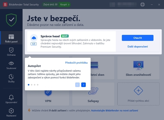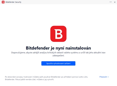 Instalace provádí Bitdefender online instalátorem - tzn. stáhne malý soubor, který dotahá veškerá další data a provede instalaci aplikace do systému. Po instalace rovnou nabídne prvotní vyhodnocení zařízení spustitelné tlačítkem Spusťte vyhodnocení zařízení. Trochu mimo rámec zvyklosti generuje Bitdefender už při prvotních operacích notifikace do Centra akcí Windows. Dozvíme se tak, že je k laptopu připojeno další zařízení, které na pozadí skenuje, že nejlepší způsob ochrany před ransomwarem je... atd. Prvotní sken trvá kapku dýl než se jeho název zdá napovídat, tak je lepší změnit jeho provádění tlačítkem Spusťte skenování na pozadí, a pokračovat rovnou do uživatelského rozhraní aplikace. Uživatele v rychlosti zorientuje průvodce. Rozhraní spoléhá na časté rozložení v podobě: