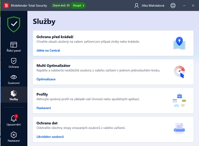 SlužbyDo kategorie Služby Bitdefender integruje Ochranu před krádeží, optimalizátor, skartovač a profily provozu. Ochrana před krádežíOchrana před krádeží běžně umožňuje vzdálené zjištění polohy zařízení, spuštění výstražného zvuku, uzamknutí či smazání všech dat v rámci jejich ochrana. Ovšem v testovém případě se jen spustil online portál Bitdefenderu bez odkázání k příslušným příkazům. Ty nešly ani dohledat. Multi optimalizátorMulti optimalizátor odpovídá svému názvu. Naplňuje nějakou, neurčitou, nepříliš specifickou, obecnou a nezacílenou potřebu optimalizace systému. Je to patrně úlitba uživatelům. Určitě neuškodí, ale ani žádné zázraky nekoná. Jen povšechně vymaže cache, dočasné soubory a zbytečné položky prohlížeče, systému a systémového registru. Používá dnes už opouštěné výchozí nastavení cílené na výchozí prohlížeč uživatele. Po vymazání mezipaměti, cookies a historie prohlížeče tak může být uživatel nepříjemně překvapen, že prohlížeč už nerozumí všem báječným kouskům, které dlouhé dny učil. ProfilyProfily představují sadu nastavení optimalizovaných pro určité využití či okolnosti využití počítače. Jednak se mohou aktivovat a mezi sebou přepínat automaticky, jednak může uživatel pro svůj počítač vybrat profil sám. K dispozici jsou: