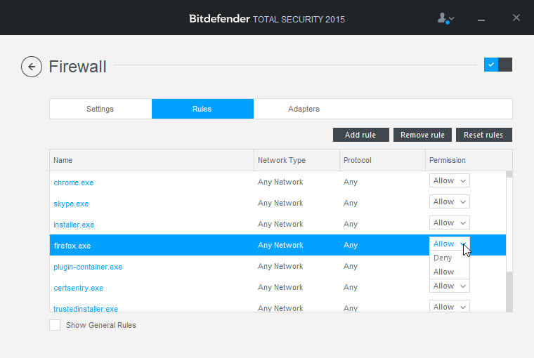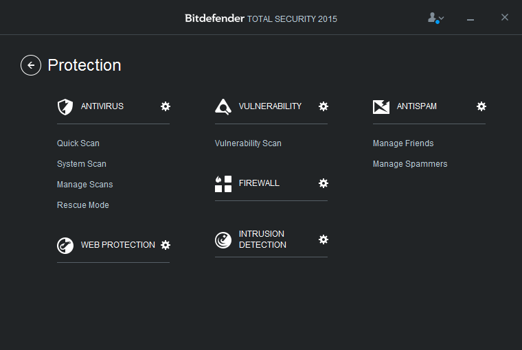 Protection aka ochranyPole Protection sdružuje všechny ochranné moduly Bitdefenderu. U každého je snadno dostupné nastavení prostřednictvím ikonky ozubeného kolečka. Moduly zahrnují: