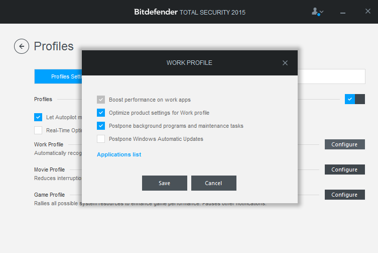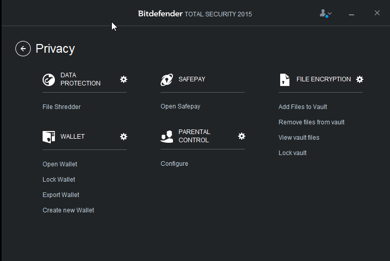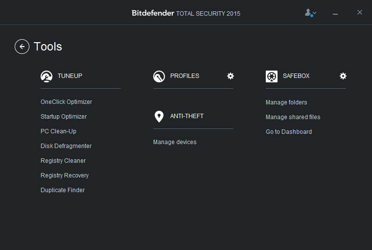 ProfilesKategorie Profiles spravuje profily práce Bitdefenderu. Jsou tři: pracovní, multimediální a herní. Každý je optimalizuje funkci programu tak, aby bylo nejvíce prostředků přiděleno aplikacím odpovídajícím danému profilu. Anti-TheftDalší utilitka fungující prostřednictvím cloudového účtu MyBitdefender. Umožňuje vzdáleně lokalizovat a uzamknout zařízení spadající pod daný účet. SafeboxA ještě jedna funkcionalita z řady cloudových - konkrétně zabezpečené cloudové úložiště s free prostorem 256 MB, upgradovatelné na 30 či 60 GB za 40 či 70 € ročně. Obecné funkce Bitdefender Total SecurityIkonka busty vpravo nahoře skrývá: