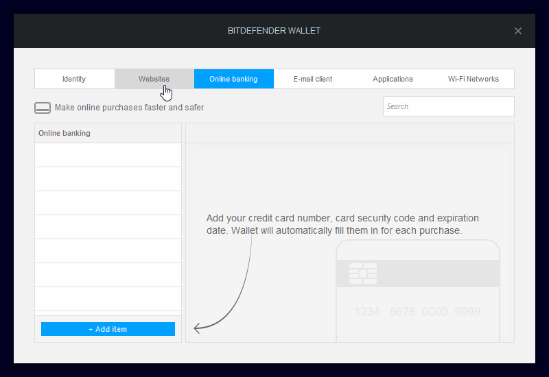 Bitdefender Total Security se zeptá se odesílání anonymních statistik, nabídne přizpůsobení instalace (volbu umístění a připojení přes proxy) a instaluje - respektive začne stahovat zbytek instalačních dat, zároveň provádí první sken počítače a instaluje se na počítač. Po instalaci se objeví ikonka bílého Béčka v červeném poli v systémové liště a na ploše průhledný terčík indikující ochranu Bitdefenderem. Terčík využívá různé animace k informování o probíhajících akcích - můžeme tak například vidět, že program skenuje počítač, stahuje aktualizace apod. Bitdefender WalletTaké se nainstaluje rozšíření Bitdefender Wallet do dostupných prohlížečů (vyzkoušeno na Firefoxu a Chrome). Bitdefender Wallet je klíčenka hesel, spravující přístupy na weby, aplikace a přístupy síťové. Navíc ukládá i informace typu licenčních klíčů. Bitdefender Wallet umožňuje jednak import stávající databáze hesel (ve formátu .DB), jednak vytvoření a správu databáze nové. Ta vzniká jednak importem hesel na stránkách uložených v prohlížečích, jednak při nových autorizovaných přístupech. Bitdefender Wallet nám umožňuje schraňovat: