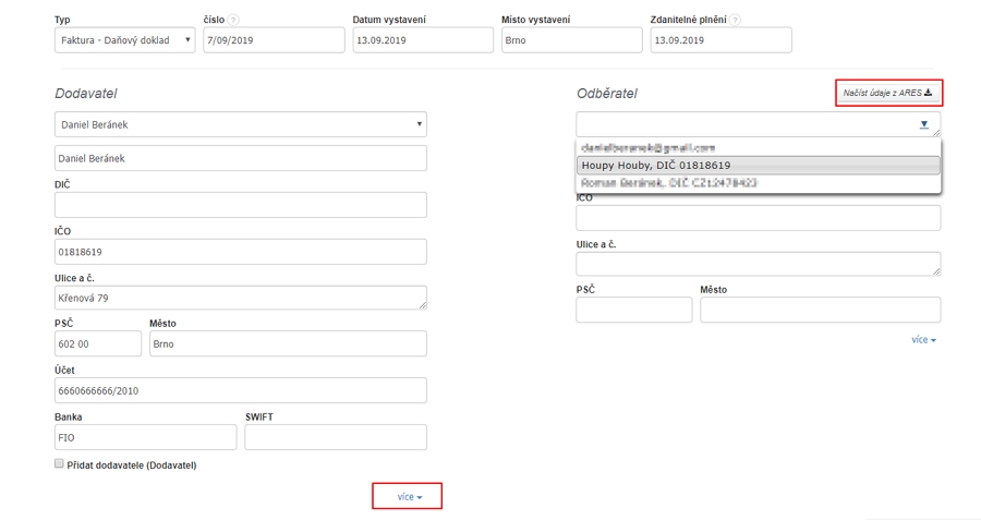 Běžná fakturaceBěžná faktura je nejpropracovanější položkou BitFaktury. Jednotlivá okénka lze vyplňovat natvrdo, z formulářových záznamů i z databází účtu. Údaje odběratele je možno načíst z ARES (tj. Administrativní rejstřík ekonomických subjektů Ministerstva financí ČR). Položky faktury lze opět doplňovat natvrdo, z webových formulářů i z databází účtu, přičemž natvrdo vyplněné položky se stávají položkami databáze Produkty. Běžné políčka doplňují Forma úhrady, Stav faktury, Zaplaceno (výše aktuální úhrady faktury), Číslo objednávky, možnost vystavení faktury v druhém jazyce včetně konverze měn, poznámky (viditelné či neviditelné při tisku) a přílohy. Pravidelná faktura a doklady s fakturací spjatéPravidelná faktura slouží opakované fakturaci. Je jí možno definovat ručně, stejně jako na základě již vystavené faktury. Krom obecných charakteristik je možno určit: