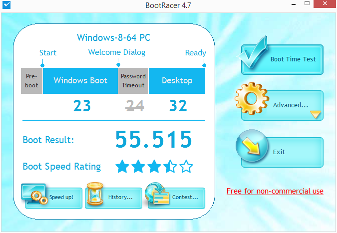 Pokud by nám nekomerční aplikace nestačila, stačí odkliknout nápis Free for non-commercial use a budeme přesměrováni ke stažení placených variant Business a Enterprise. BootRacer závěremBootRacer je přehledná a nenáročná aplikace, která prostě plní svůj jediný účel - měření zavádění systému. Pokud jsou pro vás časy startu počítače a bootování systému důležité, pak vám usnadní jejich měření a dlouohodobé zaznamenávání. Velmi snadno tak budete mít po ruce parametry startu po každém provedeném tweaku systému Windows od 2000 výše v 32 i 64bitové variantě.