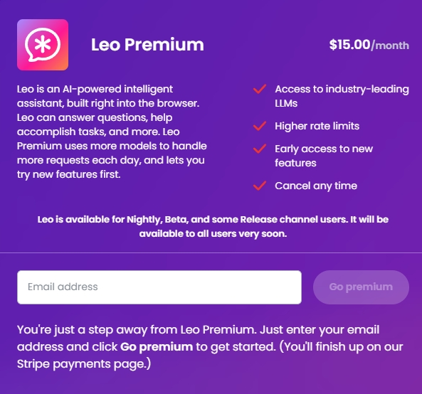 Brave Leo AI Premium podrobnějiBrave uvádí, že uživatelé Leo Premium budou mít k dispozici další modely spolu s přístupem k vysoce kvalitním konverzacím, prioritní frontou během špičky, vyššími limitami a předběžným přístupem k novým funkcím. Brian Bondy, CTO a spoluzakladatel Brave, uvádí, že