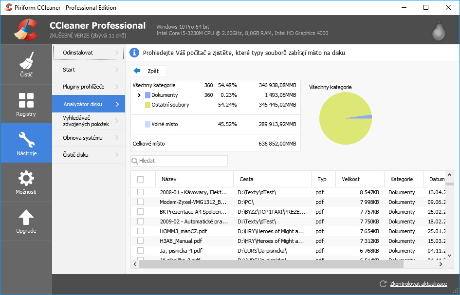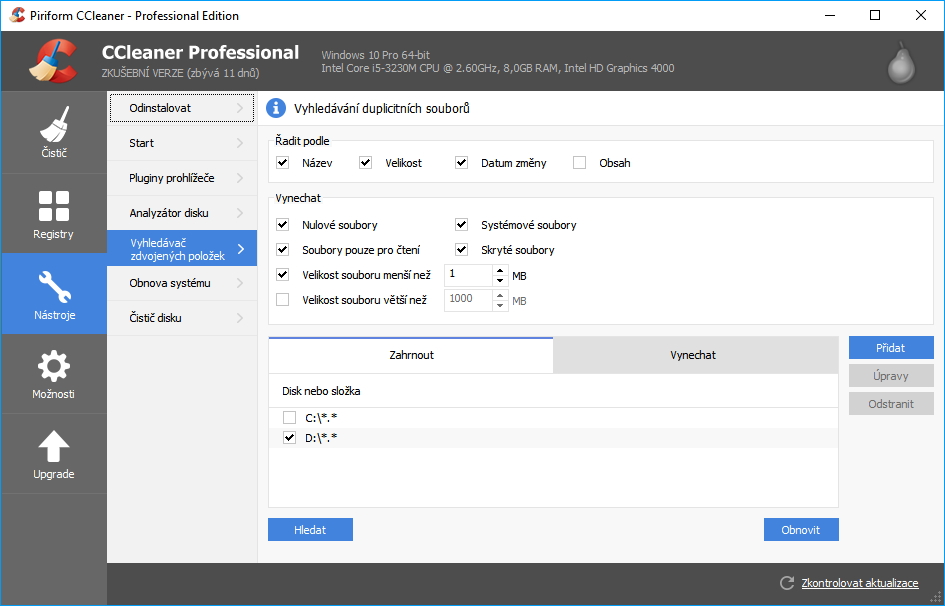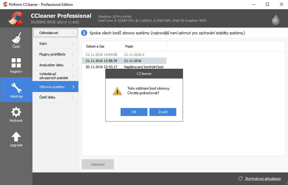 Analyzátor diskuAnalyzátor disku slouží k vytvoření rychlé představy o tom, čím jsou zaplněny pevné disky počítače. Lze se specificky zaměřit na soubory z kategorií obrázky, hudba, dokumenty, videa, komprimované, email - či si dát vypsat všechny druhy. Rozhodnutí, jak s kterým souborem naložit, a kde ho najít, pomohou informace sloužící zároveň coby filtr seřazením nalezených souborů: velikost, cesta, název a datum změny. Vyhledávač duplicitVyhledávač zdvojených souborů pomůže rychle najít zdvojené zápisy na disku. Hledání lze parametricky upřesnit (velikost hledaných souborů, zahrnutí skrytých a systémových souborů) a seřadit dle názvu, velikosti, data změny a obsahu. CCleaner zobrazí i systémovou cestu k jednotlivým verzím duplicit a nabídne jejich přímé smazání přímo z rozhraní aplikace. Obnova systémuJednoduchá utilita, možná trochu nepřesně pojmenovaná Obnova systému slouží k zobrazení všech přítomných, vytvořených bodů obnovení systému a k jejich smazání. Zobrazuje pouze datum vytvoření a popis, neumožňuje obnovit systém (jak by se z názvu mohlo zdát) a nedovolí uživateli odstranit poslední vytvořený bod obnovení z důvodu zachování stability systému. Čistič diskuČistič disku nabízí bezpečné smazání obsahu - či promazání volného místa (= vyčištění MFT tabulek a volného místa) disku. K dispozici jsou 4 různě důkladné a v závislosti na tom různě dlouho trvající metody od jednoho přepsání přes trojnásobné a sedminásobné až k pětatřicetinásobnému přepsání. Nastavení CCleaner ProfessionalNastavení CCleaneru není jen podstatné pro program jako takový, ale především pro jeho Professional verzi. A to sice proto, že zde najdeme spuštění a upřesnění mnoha placených funkcí programu. Hned na kartě Nastavení to jsou tzv. tiché aktualizace - díky nim netřeba vždy znovu stahovat CCleaner a instalovat ho do systému jako v případě bezplatné verze. Dále je zde plánovač spuštění, který umožňuje plánované spouštění s frekvencí denně, týdenně, měsíčně - či prostě po každém přihlášení. Vymezení uživatelů, kteří jsou oprávněni CCleaner používat (bezplatně může pouze jeden uživatel). A především je v placené verzi Monitoring - funkce, která umožňuje permanentní optimalizaci systému pomocí CCleaneru, aniž by uživatel do ní musel dále zasahovat. Monitoring stačí jen spustit, určit minimální množství ušetřeného místa, po němž CCleaner automaticky nabídne vyčištění, nebo zobrazí analýzu možných úspor přímo v aplikací, nebo zaneřáděný prostor rovnou uklidí. Typicky její okno vyskakuje v momentě zavření prohlížečů, neboť právě ty po sobě nechávají spoustu nepořádku. Dále v Nastavení najdeme možnost volání CCleaneru z odkazů v systému, jeho spuštění po startu počítače, defaultní nastavení bezpečného čištění, specifikaci systémových míst k vyčištění - a naopak výjimek, pokročilá nastavení vztahující se k chování aplikace samé - a - možnost nastavit zachovávaná cookies. To uvítají všichni uživatelé bezpečných webů s velkým množstvím personalizovaných nastavení, o která by jen neradi přišli při každém čištění počítače. CCleaner ProfessionalCCleaner Professional je velmi všestranný a vhodně nastavený čistič. Je připraven nejen uvolnit spousty volného místa, ale také zabraňovat nefunkčnostem a zpomalování systému, odstranit veškeré citlivé údaje uživatele a historii jeho používání počítače. Za tím účelem prochází cache prohlížečů, různá nastavení a seznamy posledních položek a systémový registr. Hlavní čištění doplňují funkce, jako jsou bezpečné promazání disku, vyhledávač duplicit či analyzátor disku. Ve výchozím nastavení je velmi citlivě nastaven, navíc uživatele informuje a varuje při čištění některých částí systému a optimalizaci systémového registru navíc zabezpečuje vytvářením zálohy registru ještě před změnou. Je znám svým optimálním nastavením a na rozdíl od konkurence se k němu nevážou žádné kauzy narušení funkčnosti systému. Přednosti CCleaner Professional