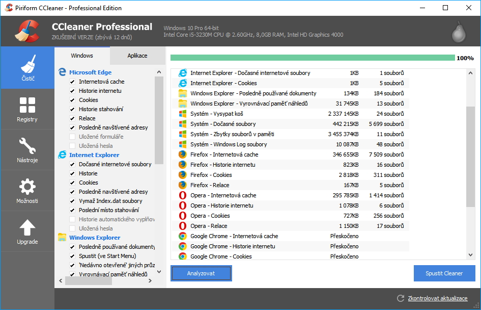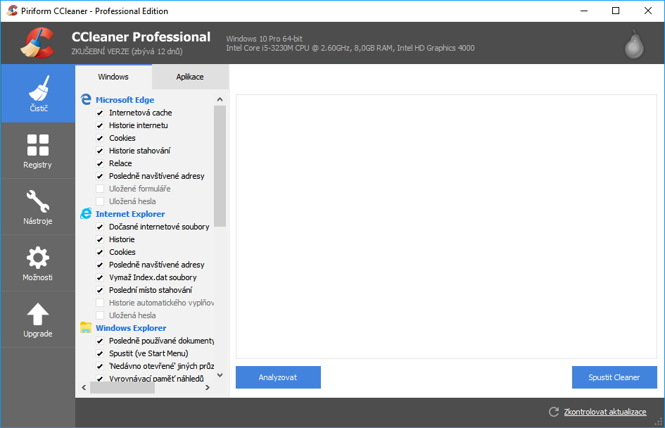 CCleaner Professional ČističČistič, ač opticky rozdělen na dvě části, provádí jednu celkovou analýzu. Položky jsou rozděleny do částí Windows a Aplikace jen z důvodu větší přehlednosti vzhledem ke svému množství. V části Windows jsou zahrnuty oba systémové prohlížeče: Microsoft Edge i Internet Explorer. Všechny položky jsou ve výchozím nastavení de facto rozděleny na potenciálně bezpečné a relativně nechtěné změny. Potenciálně bezpečné změny jsou zaškrtnuty - zahrnuty do analýzy a následného čistění. Změny možná nechtěné jsou odškrtnuty a bez zásahu uživatele nejsou provedeny. Při výběru objektů čištění je samozřejmě na místě postupovat obezřetně: mazat především to, co člověk běžně nepoužívá k práci, a naopak nepromazávat to, co není defaultně zaškrtnuto a uživatel ani neví, o co se konkrétně jedná. Specificky lze postupovat u prohlížečů. Pokud nejsou systémové využívány, lze je klidně čistit komplet celé. Naproti tomu běžně používaný prohlížeč, se stovkami nacachovaných URL adres a vyplněných formulářů, jehož podstatná část funkce spočívá v tom, že uživateli usnadňuje práci právě na základě dat, která si místně ukládá - ten je lepší nečistit téměř vůbec. Některé z potenciálně nechtěných změn jsou zvlášť ošetřeny varováním uživatele se základním popisem té které změny. Největšími generátory relativního odpadu a zároveň obsahu s citlivými údaji uživatele jsou internetové prohlížeče. Proto jim CCleaner Professional věnuje nejvíce pozornosti. Maže historii veškerého prohlížení a stahování, často vyplňované formuláře i uložená hesla, lokálně ukládaná data sloužící k identifikaci uživatele na straně webu/serveru, veškerý nacachovaný obsah (jehož smazání může zpomalit práci s prohlížečem) atd. Dalším pánem na holení je systém Windows. U toho přichází na přetřes obsah koše, dočasné soubory, zbytky souborů paměti či fragmenty souboru Chkdsk. Zároveň jsou ovšem promazávány záznamy historie používání počítače: posledně používané soubory a otevírané dokumenty, vyrovnávací paměť náhledů, nejpoužívanější aplikace v nabídce Start aj. A dostává se i na data generována samotným systémem v rámci provozu, správy a monitorování vlastních funkcí, jako jsou: hlášení chyb a protokol událostí, DNS Cache, systémová písma, starší instalace Windows aj. A zbývají už jen: