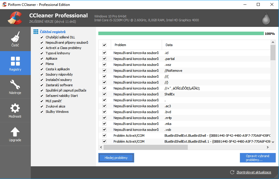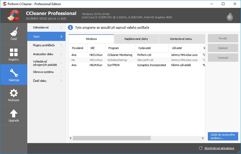 Po výběru požadovaných změn je možno buď pouze Analyzovat nebo rovnou provést analýzu i čištění pomocí tlačítka Spustit Cleaner. Při volbě Analyzovat můžeme ještě projít, co CCleaner Professional určil k vymazání, a případně jeho funkci korigovat. Po čištění pak CCleaner generuje stručný přehled toho, co vyčistil, kolik místa uvolnil a jak dlouho mu to trvalo. CCleaner Professional RegistryV systémovém registru neustále zůstávají neplatné zápisy zejména při neustálém odinstalovávání programů. CCleaner pak zaznamenává různé nepoužívané prvky, systémové cesty, nastavení, klíče softwaru, neexistující umístění... a nabízí odstranění daných položek. Změny navíc zabezpečuje možností vytvoření zálohy registru v podobě REG souboru. Poté je možné postupovat položku po položce, či odstranit všechny naráz. Práce s registry se v případě CCleaneru netřeba bát, neboť je nastaven velice šetrně a neměly by dojít k odebrání důležitých klíčů registru. Ostatní nástroje CCleaner ProfessionalOdinstalovatZákladní odinstalátor - v podstatě jen další rozhraní nad systémovou aplikací. Nenabízí pokročilé funkce. S chybně instalovanými či špatně odinstalovanými si poradí stejně jako systémová aplikace. Nevyhledává zde separátně zbytky po odinstalacích. Ovšem na rozdíl od systémové aplikace přímo zde můžeme odinstalovat systémové aplikace typu Feedback, Kalkulačka aj. StartSprávě aplikací spouštěných se systémem se dostalo středního provedení. Aplikace v seznamu Windows jsou sice zobrazeny bez vypnutých položek, ovšem nechybí tu Naplánované úkoly. Je možno upravovat Kontextové menu, ale nejsou přístupny další položky ovlivňující i start systému, jako jsou služby Windows, služby aplikací a pluginy (typu různých pluginů pro OneDrive). Přesto - především v Naplánovaných úlohách po zapnutí Pokročilého módu najdeme mnoho zápisů dávno odinstalovaných aplikací. Pluginy prohlížečeKarta pluginů nabízí nejrůznější rozšíření prohlížečů nainstalovaných v systému. Navíc zobrazuje: