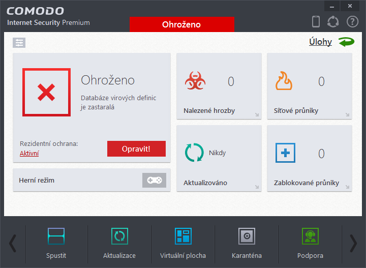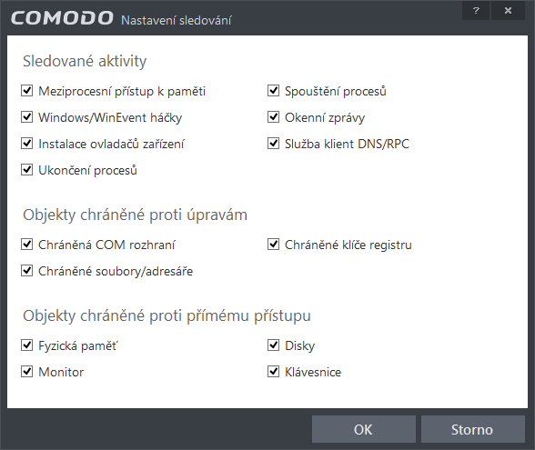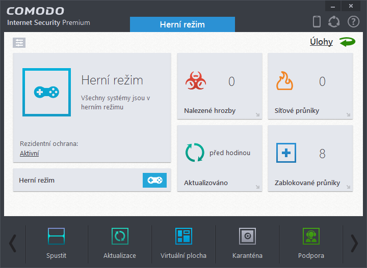 Auto-SandboxSandbox je od zbytku oddělené, virtualizované prostředí, které jednak umožňuje bezpečně spouštět potenciálně nebezpečné aplikace, jednak relativně bezpečně používat aplikace v potenciálně zavirovaném systému. Funkcionalita Auto-Sandbox automaticky spouští potenciálně nebezpečné programy v sandboxu a dává uživateli na výběr, zda má konkrétní aplikaci pro příště zablokovat nebo spouštět normálně. HIPSHIPS (Host Intrusion Protection System) je proces sledující kritické oblasti operačního systému a zabraňující jeho změnám. Na obrázku výše vidíme, co všechno může HIPS sledovat - opět mu lze nastavit míru kritického oka od deaktivace přes režim bezpečný, režim učení a režim čistého PC až po režim paranoidní. S mírou paranoie HIPS se zvyšuje i množství upozornění dané funkcionality. HIPS disponuje širokou škálou nastavení pravidel aplikací, jejich skupin a chráněných objektů. Zejména u hráčské komunity není tato funkcionalita příliš oblíbená - možná i proto je defaultně vypnuta. Herní režimHerní režim je opakem paranoidního režimu HIPS. Při jeho zapnutí Comodo nebude hráči vyskakovat ze hry, otravovat ho upozorněními, spouštět naplánované skeny systému a užírat ze systémových prostředků. Spustíme ho z hlavního okna nebo přes ikonku v systémové liště. Úlohy a Pokročilé úlohyObecné funkce bezpečnostního balíku Comodo mají ještě zvláštní část Úlohy. Schovávají se z druhé strany hlavního okna. Musíme tedy hlavní okno přepnout otáčecí šipkou, která je vlevo nahoře. Jejich prostřednictvím lze využít obecné funkce k dalším specifickým úlohám. Namátkou zde najdeme: