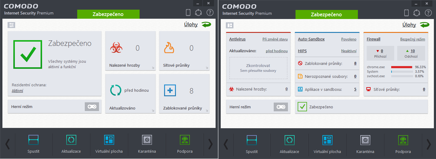 Comodo Internet SecurityComodo Internet Security poskytuje plné zabezpečení počítače zdarma - navíc je placená pouze podpora prostřednictvím GeekBuddy. Kromě antiviru a firewallu disponuje mnoha pokročilými technologiemi a funkcemi stejně jako placené balíky konkurence. Naopak zde absentují různé čistící a optimalizační utility, které nemají v čistě bezpečnostním balíku co dělat. Velkou výhodou Comodo Internet Security je možnost velice snadno virtualizovat prostředí sandboxu, používat ho ke spouštění neznámých a potenciálně nebezpečných aplikací, ale také k zabezpečení citlivé komunikace před potenciálně napadnutým systémem. Dokonce i uživatelská interakce byla v posledních verzích Comoda minimalizována ke spokojenosti těch, kteří nechtěli být otravováni neustálými dotazy na schválení spojení a spouštění programů. Na druhou stranu veškeré funkce je možno velice podrobně nastavit k plné spokojenosti druhého tábora PC uživatelů. Přednosti Comodo Internet Security