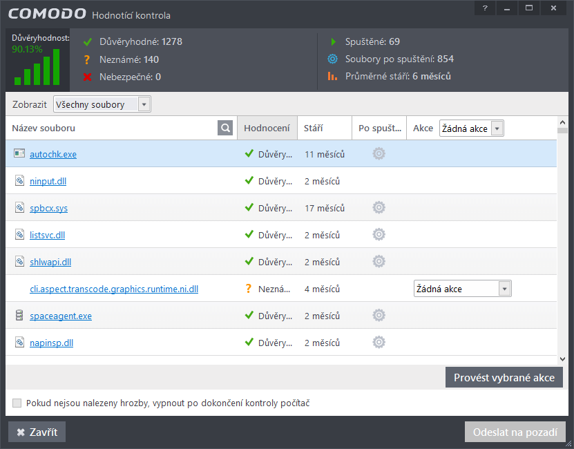 Hlavní okno aplikaceHlavním oknem rychle prohlédneme celou oblast funkčnosti programu - buď ve zjednodušeném grafickém podání (na obrázku vpravo), nebo v rozšířeném textovém zobrazení po přepnutí ikonkou vlevo nahoře (obrázek vlevo). Navíc je každé podokno grafického zobrazení prokliknutelné zvlášť, což uživateli usnadní pochopení a ovládnutí každé z oblastí činnosti Comoda. Najdeme zde Rezistentní ochranu, po jejímž rozkliknutí uvidíme zapnuté přepínače antiviru, firewallu a auto-sandboxu. Pod Nalezenými hrozbami se skrývá antivirus, pod Síťovými průniky firewall. Aktualizováno zaznamenává aktualizace. Zablokované průniky skrývají auto-sandbox a HIPS (viz dál). Přepínač Herního režimu aktivuje daný režim. Ikony spodního pásu jsou totožné s ikonami programu v panelu rychlého spuštění. AntivirusAntivirus spouštíme ikonkami Spustit a z kontextového menu v režimech rychlé, úplné, vlastní a hodnotící kontroly. Hodnotící kontrola je specifický druh kontroly: Comodo zkontroluje nejčastěji infikované oblasti, paměť, běžící procesy a programy spouštěné po startu systému a pomocí cloudu ověří reputaci všech těchto objektů. Poté nabídne jejich přehled pomocí filtrů (soubory nebezpečné, neznámé, důvěryhodné, spuštěné, spouštěné po spuštění a všechny), jejich hodnocení, přístup k jejich vlastnostem a nabídku akcí, která ovšem nabízí pouze Žádná akce nebo Důvěřovat - případné zablokování či odstranění souboru musíme provést odjinud, což ovšem samo Comodo předpokládá. Hodnotící kontrola je hotova do minuty, rychlá do deseti minut a úplná trvá kolem půlhodinky. Antivirus je krom cílených skenů také součástí rezistentní ochrany počítače. Může být inicializován buď Při změně stavu sledovaných souborů, nebo Při každém přístupu souboru do systému. V Pokročilých nastaveních lze nastavit: