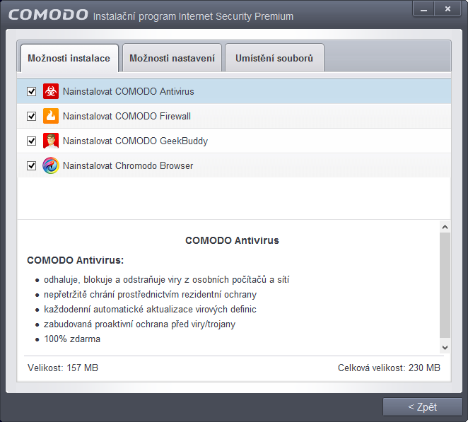 Instalace Comodo Internet SecurityPřed instalací Comodo Internet Security optimálně odinstalujeme současný antivir, firewall a restartujeme. Spustíme instalátor – ten nejprve rozbalí komprimovaná data. Poté již nás přivítá prostá instalace v češtině. Několika volbami ještě upravíme chování a komponenty programu. Vybereme, zda chceme – nechceme: