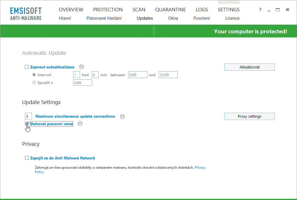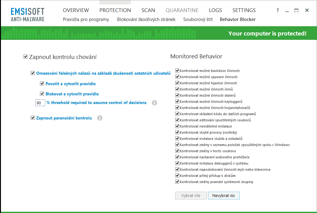 KaranténaKaranténa představuje výpis souborů identifikovaných coby škodlivé. Uživateli nabízí uložit kopii souboru, poslat ho analýzu, přehodnotit identifikaci, přímo přidat některý soubor, vyjmout nebo smazat. ZáznamyLogs nabízí záznamy činností roztříděné dle jednotlivých modulů včetně aktualizací aplikace. NastaveníSettings představují klasická nastavení. I když jsou provedena podrobně, jsou opět velmi přehledně rozdělena do kategorií. Zahrnují chování aplikace, spouštění jednotlivých modulů, optimalizace činnosti, zálohy, plánované úkoly, aktualizace, povolení činností programu Anti-Malware aj. Volba beta aktualizačního kanáluVzhledem k tomu, v jakých časech pracují skeny Emsisoft Anti-Malware, se podíváme i na betu softwaru. Dle prohlášení vývojářů na blogu se jim podařilo zkrátit časy skenů až o 82 %. Abychom zprovoznili beta kanál, stačí volit Setting - Updates - Stahovat pracovní verze. A vpravo nahoře dáme Aktualizovat. Beta si ještě vyžádá restart a už můžeme nakukovat, jakpak to s ní vypadá. V Settings přibyla podrobná nastavení sdílení informací s Emsisoftem - prostředí a ovládání aplikace nemění. Nově přibyl seznam právě monitorovaných procesů v kontrole chování (Behavior Blocker) a hlavní změny doznala kategorie Scan. Skeny jsou nyní zjednodušeny jen na rychlý, malwarový a přizpůsobitelný. Rychlost jejich provedení ještě můžeme optimalizovat: