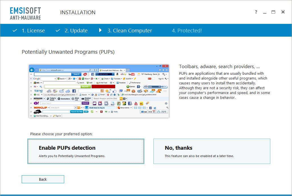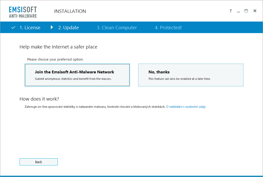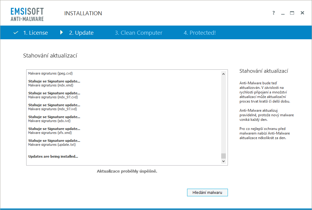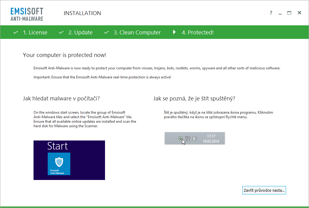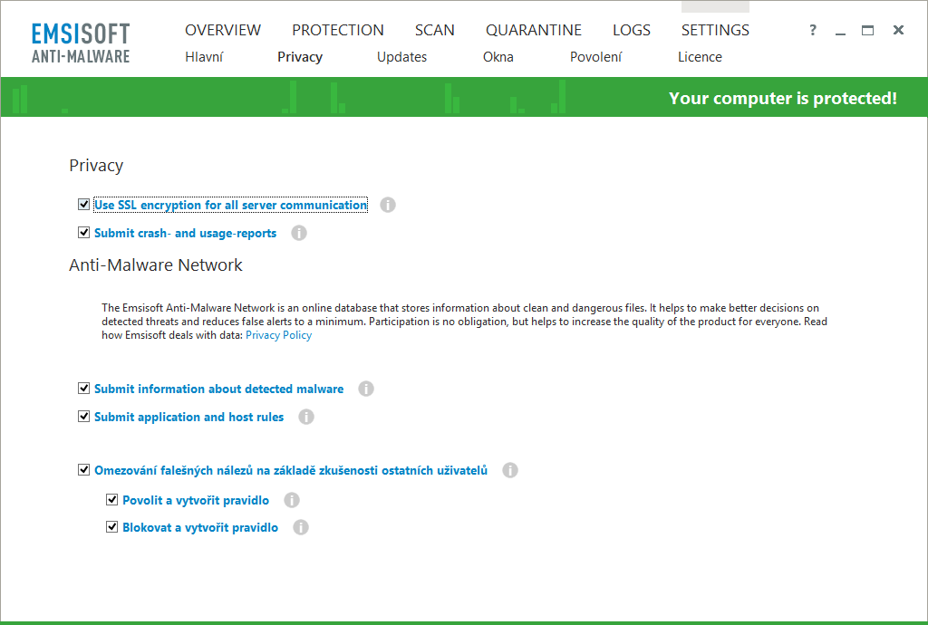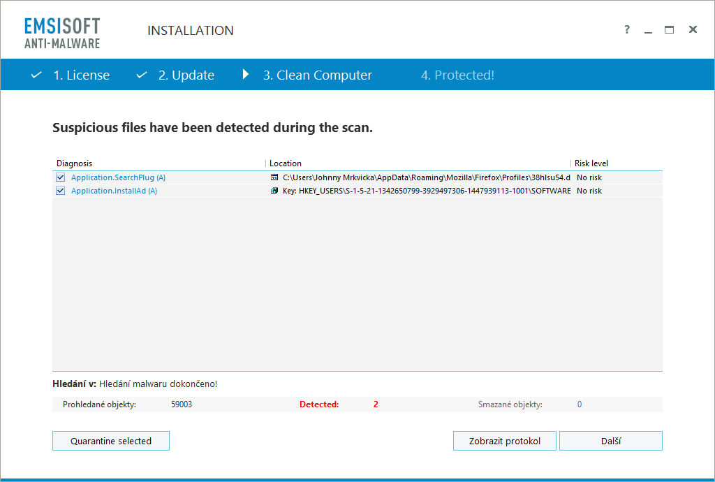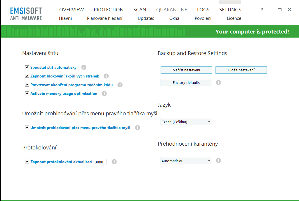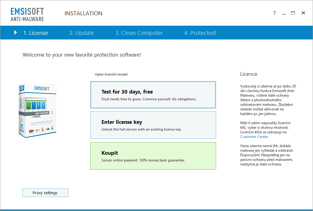 Emsisoft Anti-Malware pouze potvrdíme licenční ujednání a už se nám vesele instaluje do Program Files. Hned po instalaci na nás vyskočí obrazovka, která nám dá vybrat, zda chceme 30 dní testovat, zadat licenční kód či Koupit. Na další obrazovce si vybereme, zda chceme přispět statistikami svého střetu s malware společnosti Emsisoft. Pokračování odstartuje aktualizaci databáze malwarových infekcí. Databáze je vskutku rozsáhlá, proto její aktualizace kapku trvá (v řádu několika minut). Máme-li aktualizováno, můžeme se pustit do Hledání malwaru. Emsisoft Anti-Malware se nás ještě zeptá, zda budeme chtít odstraňovat i PUP - tedy potenciálně nechtěné programy typu různých adware, toolbarů, rozšíření. A dá nám vybrat z klasické nabídky skenů: tedy rychlý, chytrý, úplný a přizpůsobený. Rychlý sken hledá rootkity, prohledává paměť a záznamy registru. Je hotov do minuty a ve zkušebním případě identifikoval přidaný vyhledávací modul Ask.com do Firefoxu a záznam v registru po jakémsi adwaru. Po skenu už Emsisoft Anti-Malware považuje počítač za ochráněný, spouští štít operující v reálném čase (indikovaný zelenou ikonkou štítu v systémové liště) a inicializuje kompletní rozhraní programu. Úplné rozhraní je přehledné - snadno se zorientuje ve standardních částech typu skeny, ochrany, karanténa, záznamy a nastavení. SkenyDalším pánem na testování je chytrý sken. Ten kromě vyhledávání rootkitů, prohledávání paměti a registru hledá i další stopy malwaru, skenuje systémové soubory v C:\WINDOWS a další umístění. Na Smart scan běží opravdu nezdravě dlouho - zkušební test trval 104 minut, při prohledání nějakých 224501 objektů a identifikaci jednoho trojana (v odinstalátoru aplikace ReClock). Posledním skenem k vyzkoušení byl samozřejmě Full Scan. Dal se do hledání rootkitů, prohledal paměť, jal se pátrat po stopách malwaru, prohledal soubory na všech připojených harddiscích. Celkový čas hledání byl 136 minut při prohledání 260647 objektů a nalezení jednoho vyhledávacího pluginu Firefoxu. OchranyOchrany jsou sdruženy v kategorii Protection. Zahrnují: