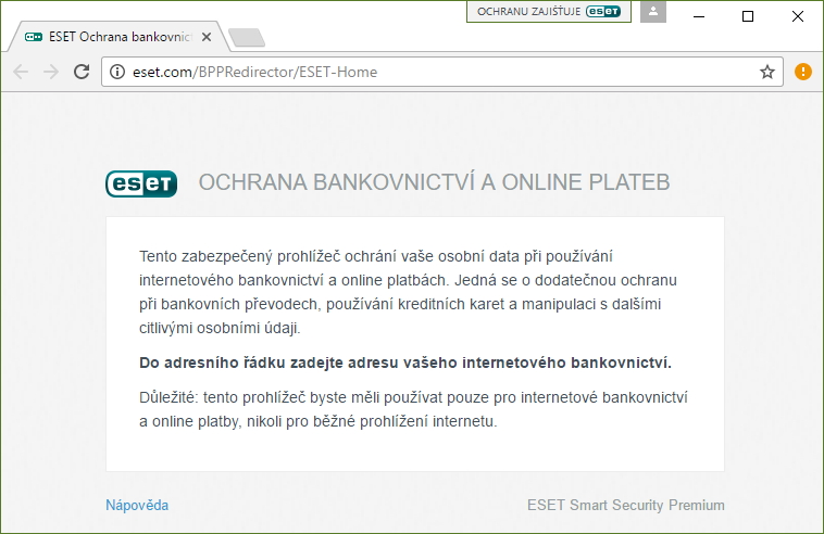 Pod Ochranou bankovnictví a online plateb se skrývá sandboxovaný prohlížeč, který je chráněn před přístupem třetích aplikací (sandboxování je zvýrazněno ohraničením okna sandboxované aplikace). Tím pádem je uživatel zabezpečen před zcizením citlivých údajů. Eset doporučuje tento prohlížeč využívat pouze k transakcím, při nichž dochází ke komunikaci citlivých údajů a k ničemu jinému. Zabezpečený prohlížeč přestat fungovat po aktualizacích zdrojového browseru. V takových případech se doporučuje službu několik nepoužívat a vyčkat na její aktualizaci, která je do aplikace doručena spolu s aktualizacemi virové databáze.