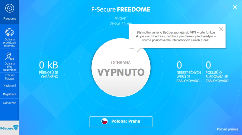 V rozhraní F-Secure zbývá ještě karta My F-Secure, což je ovšem odkaz na online rozhraní správy účtu, včetně všech účtů podřízených. F-KeyDalší části F-Secure Total už jsou volitelně přiinstalovatelné - a jsou to F-Key a F-Freedom. F-Key je správce hesel alias klíčenka. Umožňuje správu hesel a dalších citlivých údajů (vč. kreditních karet a poznámek). Dostupný import a export hesel, synchronizaci hesel mezi vícero zařízeními, možnost uložení kódu pro obnovení do podoby QR kódu aj. Nevýhodou je klasická restrikce při vytváření hlavního hesla klíčenka, která neodpovídá bezpečnostním principům. F-FreedomF-Freedom je VPN klient, tedy aplikační rozhraní zprostředkovávající zabezpečené připojení ke vzdálenému serveru a komunikaci s otevřeným internetem právě přes hrdlo vzdáleného serveru. Klasicky se takové zabezpečení hodí na otevřených sítí (kde potenciální útočník nemůže takto odposlechnout zašifrovanou komunikaci se vzdáleným serverem) či při potřebě komunikace s otevřeným internetem přes jinou, než vlastní IP adresu. Po připojení k privátní síti umožňuje F-Freedom přístup do internetu z 29 geograficky různě umístěných IP adres. Samotný VPN klient dubluje ochranu proti nebezpečným serverům, „na kterých se může nacházet nebezpečný obsah nebo které by mohly odcizit osobní údaje...“ už na úrovni vstupního serveru. F-Freedom dále nabízí ochranu proti trackování (sledování uživatele při jeho navigaci internetem napříč jednotlivými navštívenými weby) a dále Tracker Mapper, jenž uživateli pomůže protokolovat způsob, jakým ho weby sledují při celodenním procházení internetu. Nastavení F-Secure TotalNastavení má každá z programových součástí (F-Safe, F-Key a F-Freedom) separátní. Ostatně jsou designovány i coby separátní aplikace, nikoliv aplikační balíček. Nastavení hlavní součásti (antivirového F-Safe) se fakticky zaměřuje jenom na antivirové funkce samotné. A to velice jednoduchým způsobem, který vyhovuje každému běžnému uživateli - tedy: Ochrana v reálném čase? Zapnout! Firewall? Zapnout! a 3 doplňující volby sekundární důležitosti. Firewall je fakticky aplikačním nastavením systémového firewallu.. F-Secure Total coby celek?F-Secure je na pohled velmi jednoduchý. Což potěší běžného uživatele, možná by mohlo odradit pokročilé uživatele a vyvolá pochyby v komkoliv, jemuž jednoduchost rozhraní sama o sobě není znakem čehokoliv. Nicméně - F-Secure se dlouhodobě drží velmi vysoko ve srovnávacích testech nezávislých antivirových laboratoří, jako jsou např. AV-Comparatives. Vícekrát se mu podařilo obsadit první místo v naprosté neprůstřelnosti (kterou sem tam ohrozí simulovaná inteligence testující osoby). Navíc získal ocenění i v testech vytěžování systémových prostředků, z nichž vyšel nejlépe společně s Esetem. Navzdory dojmu je jádro programu výborně nastaveno k ochraně uživatele. Jen ocenit se dá rodičovská kontrola. Je opravdu jednoduchá na nastavení (což je první krok při zabezpečování: neodradit uživatele). Nabádá k diskuzi s dítkem nad tím, jakým způsobem jsou mu nastaveny restrikce používání počítače a internetu (= 2. krok zabezpečení: participativní dohoda místo zákazu, která morálně lépe odolává pokusům o porušení). A vše se dá upravit vzdáleně. Díky své jednoduchosti se opravdu může stát užitečným pomocníkem rodinného provozu, místo toho aby byla složitou osinou, jíž v důsledcích všichni nenávidí. A doprovodné aplikace? Zde už záleží na chuti každého uživatele. Klíčenka je standardní. VPN klient je povedený. Nabízí rychlé připojení, snadné ovládání a jednoduché ovládání, díky čemuž se opět může velmi snadno stát součástí každodenního zabezpečení připojení třeba na otevřených sítích. Výhody F-Secure Total