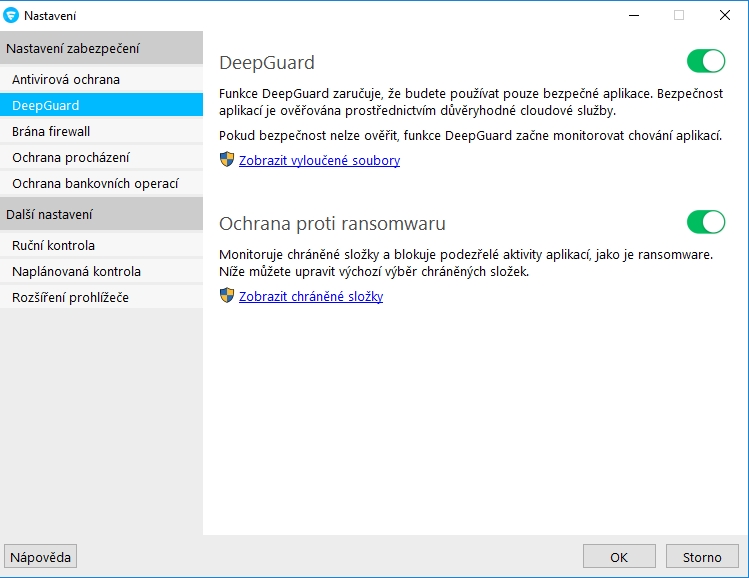 Nastavení je přístupné přímo v dané sekci - což se cení:). Její rozkliknutí ovšem nepotěší vášnivé nastavovače, neboť obsahuje jen pár základních šoupátek fungujících na úrovni ANO x NE. Nicméně nejen ti okamžitě uvidí, že F-Secure staví na:
