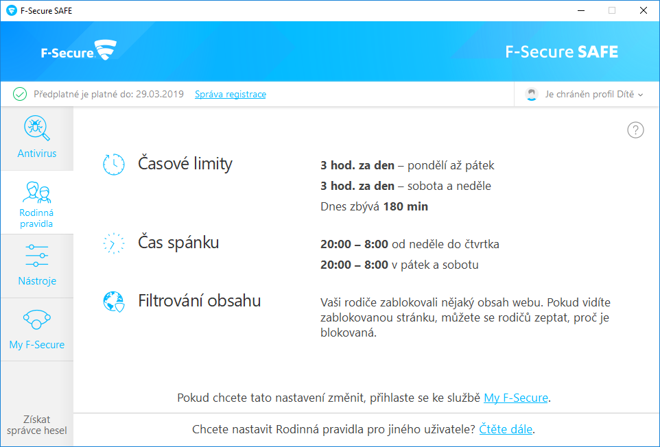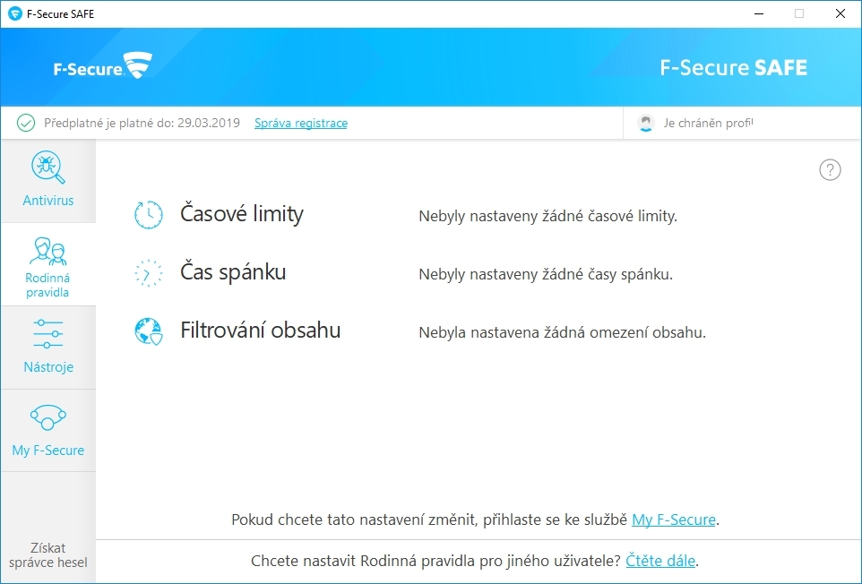 F-Secure potom zahlásí nastavení ochrany a administrátora odhlásí z online účtu. Veškerá nastavení instance F-Secure na dětském uživatelském účtu se pak dají vzdáleně konfigurovat z online rozhraní účtu správce. F-Secure po celou dobu nastavování v podstatě nabádá rodiče k nastavení rodičovské ochrany společně s dítětem. Ve smyslu ochrany tak plní další funkci - akcentuje dohodu namísto zákazu, a tím pádem snižuje riziko prolomení nastavených zábran. NástrojeNástroje je sekcí, která tak zcela neodpovídá svému názvu: