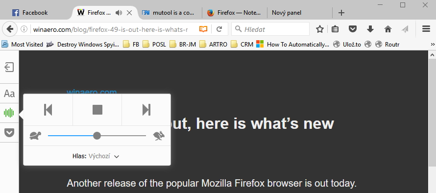 Firefox Hello: Bye ByeMozille nevyšla sázka na Firefox Hello. Tento komunikátor měl zprostředkovat videokomunikaci, byl rozšířen o možnost instant chatu, o funkci k okamžitému procházení stejným webem spolu... Nicméně nenašel si své publikum, a tak s Firefoxem 48 končí. Mozilla jeho příznivcům doporučuje přechod na Talky, Cisco Spark, Appear.in či Jitsi Meet a slibuje, že technologii WebRTC, na níž Firefox Hello běžel, bude nadále vyvíjet a zdokonalovat. Předčítání - nebo zatím spíš ReaderDobře provedenou novinkou je Předčítaní v režimu čtečky - zatím alespoň v angličtině. Zatím je k dispozici totiž jen výchozí hlas Microsoft Zira Desktop - English (United States). Přesto je šikovně provedeno a dobře se ovládá. Lze určit rychlost předčítání, přeskakování bloku textu dopředu a dozadu, samo označuje čtený text a posouvá stránku, lze umlčet nejen pomocí Stop, ale i okamžitým ztišením stránku přes ikonku reproduktoru na oušku panelu. Čtečce se dostalo vůbec více změn, text si tak nyní můžeme nejen typizovat, zvětšit, a určit jeho barvy jeho a jeho pozadí, ale také roztáhnout vůči strany a změnit řádkování. A dále...Firefox by měl nyní běhat rychleji na systémech, které neumožňují hardwarovou akceleraci prohlížeče. HTML5 videa lze přímo z kontextové menu Firefoxu přehrávat o čtvrtinu vyšší rychlostí a cyklovat do smyčky. Správce hesel umožňuje přihlášení na HTTPS variantě webu i pomocí hesla, které má uloženo z nešifrované HTTP verze webu. Záplaty se dostalo celkem osmnácti bezpečnostním zranitelnostem, čtyři z toho byly kritické. A byla ukončena podpora systémů OS X 10.6, 10.7 a 10.8 a sestav s procesory využívajícími instrukce SSE. Multiprocesová architektura Electrolysis aka e10Mozilla slibuje další rozšiřování verzí Firefoxu s novou multiprocesovou architekturou e10. Pokud se na vás nedostalo - a že to vypadá, že v české verzi zatím není - stáhněte si třeba noční sestavení a povolte ji přes Options - General - Startup - Enable multi-process Nightly. Zdroje: Firefox Release Notes, Firefox Help