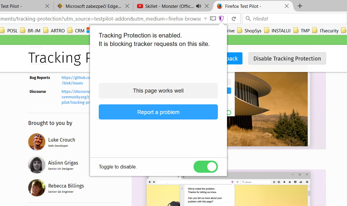 Page ShotPage Shot je snímač obrazovky doplněný sdílecími funkcemi. Pohodlně s ním vymezíte snímanou oblast (výběr lze upravovat - nemusí být na první dobrou) a dáte uložit na web pageshot.net Mozilly (defaultně je nastaveno uložení na 14 dní, nicméně lze je specifikovat od 10 minut po neurčito). Odtud jej lze pohodlně sdílet buď linkem, nebo mailem či přímo na sítě Facebooku, Twitteru a Pinterestu. Také jej můžete okamžitě stáhnout a vymazat. Web Page Shotu vám navíc umožní procházet takto pořízené snímky coby náhledy a také v nich vyhledávat pomocí tagů, které vytváří z meta titulku snímané stránky a textu, který je na snímku. Min VidMin Vid je vyskakovací okýnko videa, obdoba fičury video pop-out z Opery. Po odkliknutí ikonky Min Vid přímo ve videu, toto vyskočí do samostatného okýnka, které má vlastní ovládací prvky včetně možnosti přesunutí okénka, jeho minimalizace či opětovného vyskočení do panelu. Bohužel v době testování se funkce nerozběhla ani pro jedno testované video. Tracking ProtectionTracking Protection (čili ochrana proti sledování) není fičura zcela nová. Nicméně doteď byla defaultně spouštěna jenom v anonymním režimu. Chcete-li se tedy ochránit před prvky, které mapují váš pohyb napříč internetem i v běžném režimu - aniž byste používali Noční sestavení Firefoxu, či se šťárali v pokročilých nastavení about:config - můžete k tomu použít tento doplněk.