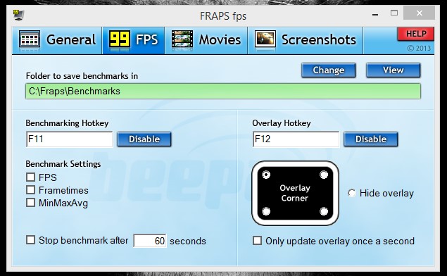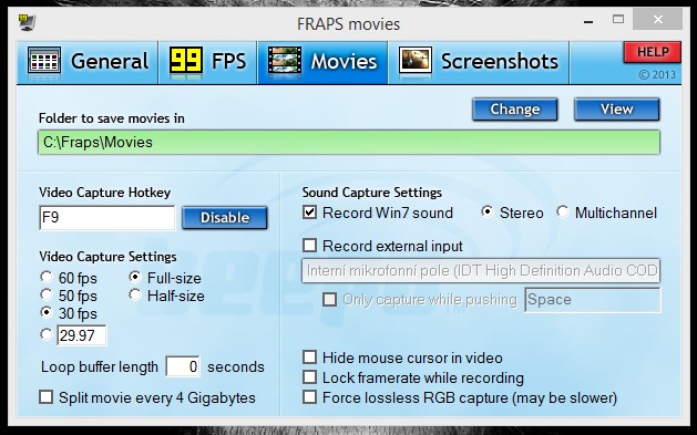 ![]() V rohu obrazovky aplikace Fraps měří a také i přehledně zobrazuje hodnotu FPS (Frames Per Second/Obrázky za sekundu), což je ovlivněno hned několika věcmi a díky tomu jsou také jinak kvalitní obrázky při různých situacích. Fraps je tedy aplikace určená pro záznam videa a pořizování screenshotů na vaši obrazovce u stolního počítače nebo notebooku. Aplikace je natolik nenápadná, že ji nebudete prakticky ani vnímat. A navíc je aplikace pro Windows zcela zdarma, což je další důvod, proč si ji třeba ihned pořídit.