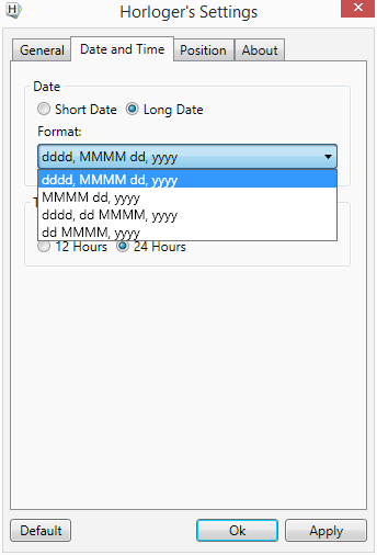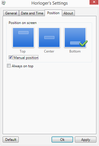 RAR s programem obsahuje verzi jak pro 32bitovou, tak pro 64bitovou platformu. Rozbalíme a nainstalujeme běžným postupem. Při instalaci lze ještě zvolit češtinu, v programu samotném pak už musíme vybrat některý z populačně rozšířenějších jazyků. Po startu nám v horní polovině obrazovky uprostřed vyskočí hodiny ve výchozím nastavení. Tedy v tzv. pozici Top, ve výchozím skinu a ve výchozím zobrazování jednotlivých položek času. Po kliknutí na ně levým tlačítkem myši s nimi nepůjde pohnout – jen se bude zobrazovat rozmazaný nápis Please select manual position. Je třeba poklepáním pravým myšítkem zvolit Settings a upravit si hodiny k obrazu svému. Pravděpodobně budeme nejprve chtít změnit jejich umístění – to se nalézá pod Position - Manual position a potvrdit Apply. Zde můžeme zvolit některé přednastavené umístění (Top, Center, Bottom) a zobrazení hodin vždy nad ostatními otevřenými okny (Always on top). Pokud chceme hodiny stále zobrazovat vepředu, je vhodné zvýšit průhlednost jejich animace. To učiníme v General pod Background transparency. Mění se pouze průhlednost vedlejších prvků, hodiny zůstávají zachovány co nejviditelnější. Zvolenou průhlednost lze také uplatnit na pozadí znázorněného data. V General nastavíme zobrazování položek. Pokud necháme velkém vyobrazovat i sekundy (Display Seconds), uvidíme vedle nich freneticky se měnící milisekundy. Při zrušení zobrazení sekund se nám tyto sice přestanou vyobrazovat ve velkém formátu – ale nahradí místo milisekund, a sníží se náročnost programu na pracovní paměť. V General také upravíme jazyk rozhraní, start programu se systémem a vzhled. Máme k dispozici pět skinů – krom výchozího ještě zmenšený výchozí, placatou 2D verzi, hodiny na skleněné ploše a pro fandy dlaždic i dlaždicovité zobrazení hodin (viz obr. pod článkem). V Date and Time zvolíme 12/24hodinový formát času. U data lze nastavit: