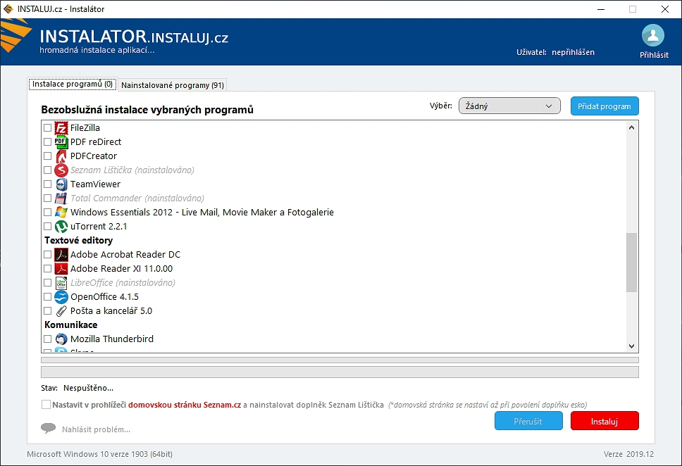 Takto zkompletujeme výběr všech požadovaných programů. Vývoj Instalátoru InstalujZa Instalátorem stojí vývojářská firma PS Media. PS Media vyvíjí širokou škálu programů - mimo jiné ve spolupráci se společností Seznam.cz. Právě z této spolupráce pochází i Instalátor Instaluj. Je volným pokračováním projektu Seznam Instalátor. Původní kód ovšem prošel revizemi na základě zkušeností správců IT sítí a profesionálních vývojářů softwaru. Byly zjednodušeny mnohé dílčí kroky, bezproblémovost nových instalací a hlavní funkce programu jako takového. PodporaJakýkoliv problém či otázku směřující na program vyřešíte buď přímo v programu (přes tlačítko Nahlásit problém), nebo přes email support@instaluj.cz. Primární výhody Instalátoru InstalujInstalátor Instaluj je nenahraditelný pomocník při hromadných instalacích - ať už ta hromada představuje hromadu programů, nebo hromadu počítačů, které mají být oinstalovány - či dokonce to má být hromada aplikací nainstalovaná na hromadu počítačů. Vše lze připravit na instalační flashku, která pak provede tichou instalaci všech zahrnutých programů. S toutéž flashkou se pak dá obejít například 20 obsluhovaných počítačů - či ještě lépe flashku x-krát zkopírovat a spustit tutéž instalační sérii na všech strojích najednou. Další přednosti