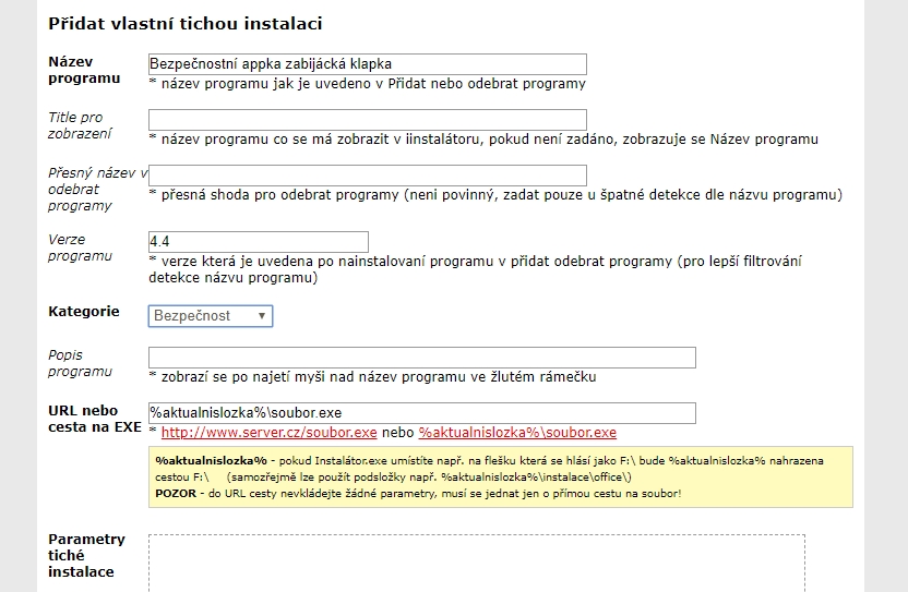 Doplnit pak ještě můžete platformu (32 či 64bitová) a interní poznámku k programu. Instalace programů se zdrojem na vzdáleném serveru se liší pouze v bodě 5 - tedy určení cesty k instalačnímu souboru. Zde je třeba zadat celou URL adresu včetně názvu souboru a formátové koncovky typu https://priklad.cz/instalacni-soubory/instalace-imatrikulace.exe. A ještě: