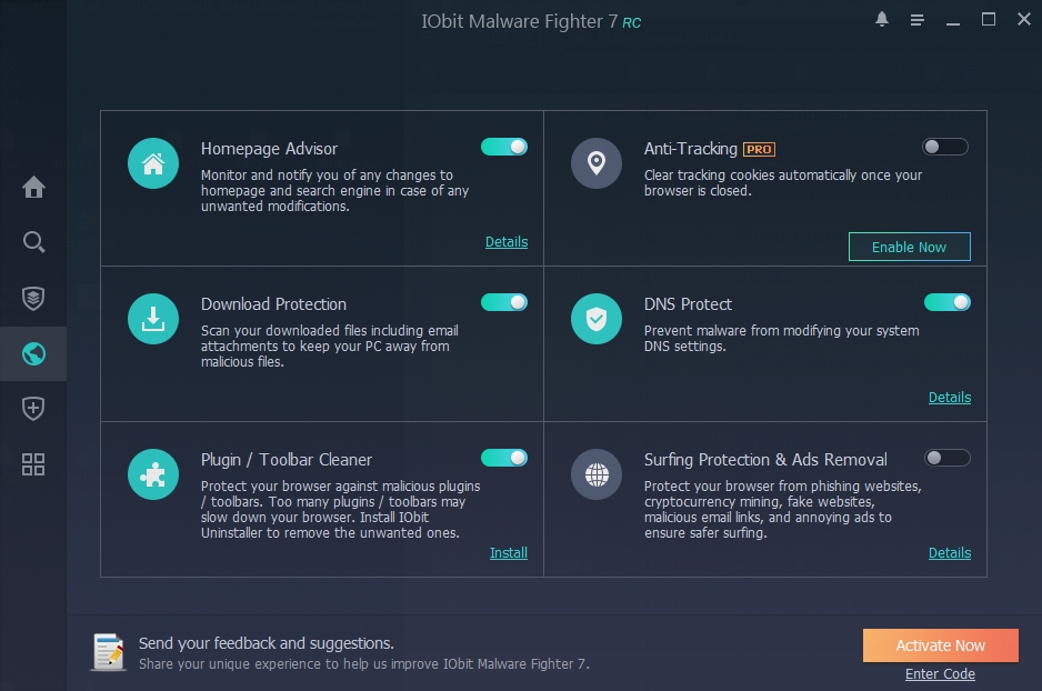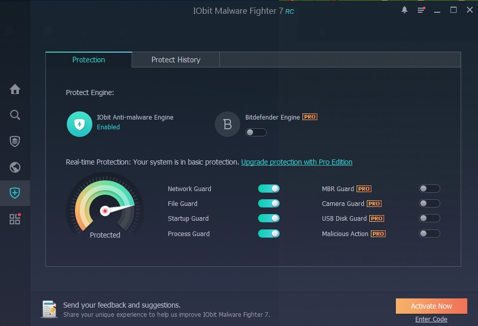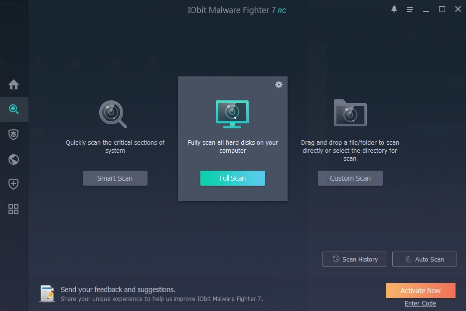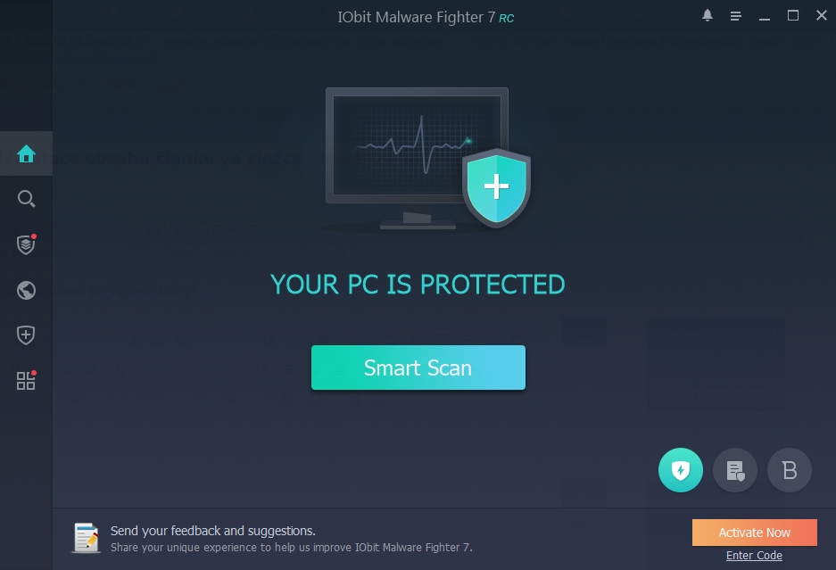 IObit Malware Fighter není lokalizován v celosvětovém měřítku, a proto se uživatelé budou muset spokojit s některým z rozšířených jazyků. Instalace je prostičká: lze volit jen systémové umístění, ikonu na ploše a hlavním panelu. Jak bývá dobrým zvykem u mnoha bezpečnostních programy, i IObit Malware Fighter nás hned po nainstalování možnými riziky přítomnými v počítači. Typicky tím všechny aplikace mají na mysli to, že jsme ještě nezkontrolovali aktualizace jejich programových komponent a virových databází. Červená varování snadno odstraníme tím, že jednoklikovou volbou Fix All provedeme jak aktualizaci virových definic, tak první sken systému. Ten je označen coby Smart Scan, čímž se běžně označují kontroly zaměřené spíše na rychlost a omezené skenování pouze kritických částí systému. Na chytrý sken běží na zkušebním systému trošku dlouhých 17 minut 43 sekund. Poté se IObit Malware Fighter uklidní a červené varování o možném nebezpečí vystřídá oznámení o tom, že počítač je chráněn, v uklidňující modrozelené barvě. Iluzorní klid nám umožní ponořit do funkcionalit programu. Výchozí obrazovka je indikuje stav ohrožení či zabezpečení systému, rychlý přístup k jednoklikovému Smart Scanu a běžící antimalwarová jádra. FREE verze disponuje pouze antimalwarovým jádrem od IObit, verze PROFESSIONAL je dovybavena antiransomwarovým jádrem taktéž od IObit a antivirovým a antimalwarovým jádrem od Bitdefenderu. SkenySekce skenů - na bočním menu vyznačená lupou - má typické rozdělení na sken chytrý, úplný a cílený. Poslední jmenovaný dovoluje zacílit nejen konkrétní místa v systému, ale i potenciálně škodlivé procesy a kritická místa systému. V sekci najdeme i historii a výsledky skenů minulých a možnost naplánování pravidelných skenů. Browser Protect: ochrana prohlížečůBrowser Protect označuje ikonka zeměkoule bočního menu. Zahrnuje několik prostých funkcí: