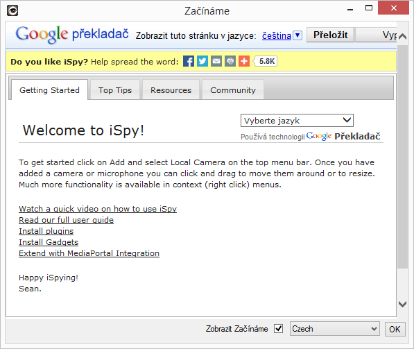 iSpy standardně nainstalujeme. Hned po startu vyskočí nabídka rychlého úvodu do programu Getting Started, což je okno zprostředkovávající informace z webu www.ispyconnect.com. Hned dole si můžeme nastavit češtinu pro celé rozhraní. Úvodní tipy program nabízí přeložit do lámané češtiny Google Překladače. Pokud by nás čeština v programu spíše mátla, volbu jazyka najdeme v Možnosti - Nastavení. První položka výchozí obrazovky nás vybízí Přidat – zde tedy nastavíme zařízení, s jejichž záznamy chceme pracovat. Coby zdroj videa lze přidat webkamery, IP kamery, ONVIF a další zdroje video obsahu – VLC, MJPEG, FFMPEG aj. Nastavíme přihlašovací jména, hesla, adresy, dešifrovací klíče, rozlišení a počet snímků. Po tomto základním nastavení se nám přidá zařízení – objeví se jeho okno na pracovní ploše programu a vyskočí velmi podrobné nastavení daného zařízení. Nastavíme tedy kameru a mikrofon. Dále detekci pohybu – především citlivost detekce a detaily poplachové události: iSpy nabízí spuštění programu, volání URL, přehrání zvuku a odeslání zpráv (síťových, SMS, Twitter, e-mail) aj. Krom poplašné reakce lze zvolit i nahrávání a jeho charakteristiky. Můžeme volit jak video formáty, tak snímkování. Mimo archivace záznamu na lokálním úložišti, lze ukládat přes FTP a cloudové služby, nebo rovnou nahrávat na YouTube. iSpy nám dovolí použít k záznamům i časovač. Navíc máme možnost managovat skladovací charakteristiky: omezovat záznamové časy a velikosti. Můžeme vytvářet seznamy zdrojových objektů – a mít vždy po ruce vzorec pracovních zdrojů. Vzdálený přístup iSpyPro správu více kamer a vzdálený přístup k jednotlivým zařízením využijeme online služby iSpy. Po zaregistrování máme k dispozici webové rozhraní, v němž můžeme sledovat záznamy obsluhovaných zařízení. Z rozhraní lze vykonat příkazy, které si na jednotlivých zařízeních nastavíme. Coby zdroj obsahu, ale i nástroj ovládání iSpy lze využít také mobilní platformy Android, iOS a Windows Phone. Přímo v rozhraní jsou přístupna videa, snímky a logy jednotlivých kamer. Zdroj lze také přímo streamovat na web. Pluginy iSpyZákladní funkce doplňuje několik dodatečně instalovatelných pluginů. Patří mezi ně: