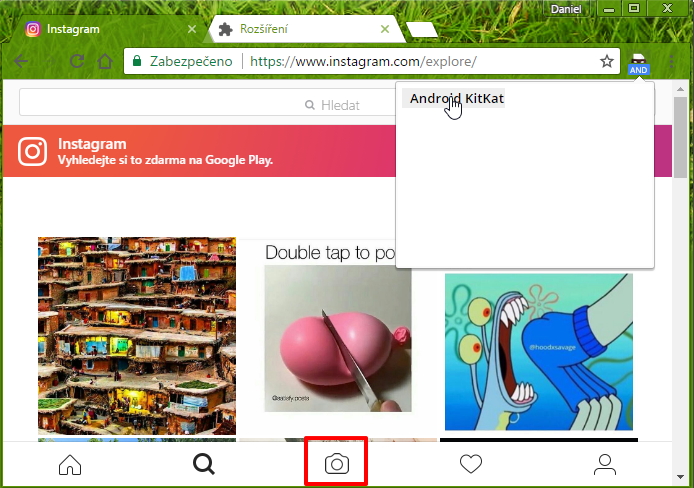 Klasická webová aplikace na desktopu postrádá spodní menu, v kterém se mj. skrývá i upload fotek. Ani aplikace pro Windows 10 vás k uploadu nepustí, leda že by se vyskytovala na tabletu. Můžete si tedy fotky trapně přeposílat na telefon a postovat z něj, nebo využít jedné kličky. Instagram totiž umožňuje i postování z webové aplikace, ovšem z mobilních zařízení. Prohlížeč se tedy musí identifikovat jako mobilní. No a k tomu už potřebujeme patřičný doplněk - např. User-Agent Switcher for Chrome nebo User Agent Switcher pro Firefox - který upraví hlavičku (user agent) prohlížeče tak, aby se identifikoval coby mobilní. Doplněk spustíme, z jeho menu vybereme mobilní operační systém a zamíříme na Instagram.com. Tam už nás bude čekat známé spodní menu včetně klíčového tlačítka uprostřed pro nahrávání fotek.