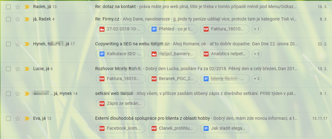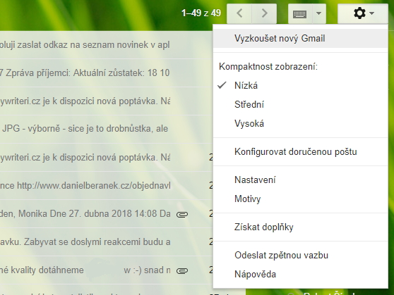 Kompaktnost zobrazeníNejvíce asi první dojem z přechodu na novou podobu Gmailu ovlivní kompaktnost zobrazení. Možnost její volby je přítomna nejen v úvodních obrazovkách přechodu, ale také v Nastavení nového Gmailu. Hodnota Výchozí vykresluje maily včetně příloh, jejich názvů a ikonek ilustrujících typ souborů (dle toho, jak jsou tyto typy zobrazovány v Google Disku). Volba Nízká eliminuje toto podrobné vykreslení příloh - zůstává pouze ikonka sponky na pravém konci řádku mailu. Při preferenci Vysoké kompaktnosti se odstupy mezi řádky sníží na minimum. Změna patrně vyvolá obvyklou odezvu nevole, ale při troše dobré vůle si člověk najde vyhovující míru kompaktnosti zobrazení. Naopak velmi vítané mohou být prvky minimalizující počet kroků k vykonání jednotlivých operací, jako je zobrazování prvků okamžité interakce přímo v řádku požadovaného mailu, a lepší responzitivita prostředí.