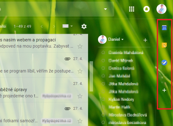 Lištička rozšířeníNa pravé straně prostředí se objevuje lištička pro rychlé zobrazení dalších nástrojů Googlu (Kalendář, Google Keep, úkoly Google Tasks) a s možností přidání dalších rozšíření z G Suite Marketplace. Aplikace Googlu umožňují: