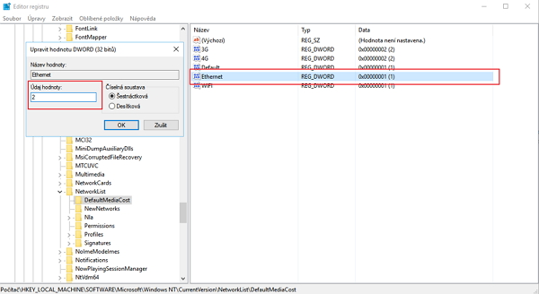 Touto úpravou registru přinutíme Windows 10, aby nabízel možnost Nastavit jako připojení účtované podle objemu dat i pro pevná připojení. Pokud bude chtít úpravu zvrátit, stačí se vrátit přes HKEY_LOCAL_MACHINE\SOFTWARE\Microsoft\WindowsNT\CurrentVersion\NetworkList\DefaultMediaCost k hodnotě Ethernet a opět nastavit Údaj hodnoty na 1. Veškeré zásahy do systémového registru jsou pouze na vlastní nebezpečí.