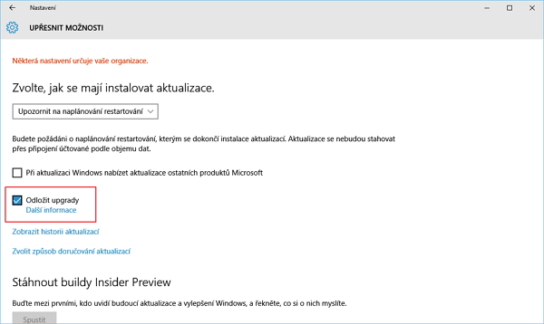 Aktualizace se sice stáhne do počítače, po jejím stažení ovšem budeme upozorněni na naplánování restartu a instalace. Místo automaticky navrhovaného času, je pak třeba zvolit co nejzazší termín restartu a instalace - a tím se jim vyhnout. Oddálení pomocí funkce Windows 10 Pro Odložit upgradyElegantnější způsob vyhnutí se výročnímu povýšení systému je odložení upgradu pomocí stejnojmenné funkce. Výhodou této cesty je nejen to, že se instalace ani nestáhne (nebude zabírat místo na disku, vytěžovat limit datových přenosů), ale taky se nám nestane, že bychom nepozorností nechali Windows, ať automaticky naplánuje restartování systému, a tím nainstalovali výroční povýšení. Má to jen jeden háček, musíte používat Windows 10 ve verzi Pro: