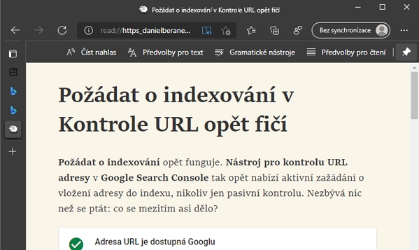 Asistivní čtečka se sama spustí na stránkách, které režim čtečky podporují. Mimo jiné je poznáte dle ikonky čtečky v pravé části adresního řádku. Vyzkoušet můžete na textu Požádat o indexování v Kontrole URL opět fičí - zobrazení by mělo mít tuto podobu: Asistivní čtečka se spustí na všech webech. Vzhledem k tomu, že je to funkcionalita ve fázi testování, neumožňuje vybrat, na kterých webech se má spouštět a na kterých nikoliv. Zdroje