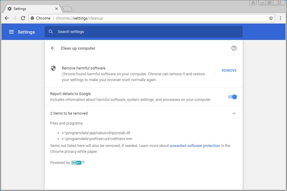 Chrome Cleanup v laboratořích ESETu naučili vyhledávat nejen malware, ale také rozličné adwary, crapwary, software typu nefunkčních či podvodných rozšíření i kód těžící kryptoměny. Jediným omezením Chrome Cleanupu je to, že prohledává pouze složky a částí systému přímo související s internetovými prohlížeči. Není tedy plnohodnotnou náhradou antivirového řešení. Chrome Cleanup spustíme pomocí příkazu chrome://settings/cleanup zadaného do Google Chrome. Načež se zobrazí obrazovka, na níž kontrolu zahájíme odkliknutím Najít u položky Najděte škodlivý software a odstraňte jej. Následně probíhá antimalwarový sken, který při identifikaci škodlivého kódu vyhodí hlášku o položkách k odstranění a systémové cestě k nim. Po odkliknutí Odstranit je ještě změny prováděné Chrome Cleanup potvrdit v Řízení uživatelských účtů a následně restartovat počítač. Zdroje: Bleepingcomputer.com