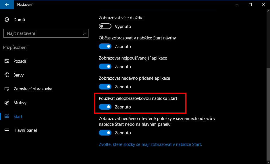 Zapnutí zobrazení nabídky Start přes celou obrazovku je snadné - stačí: